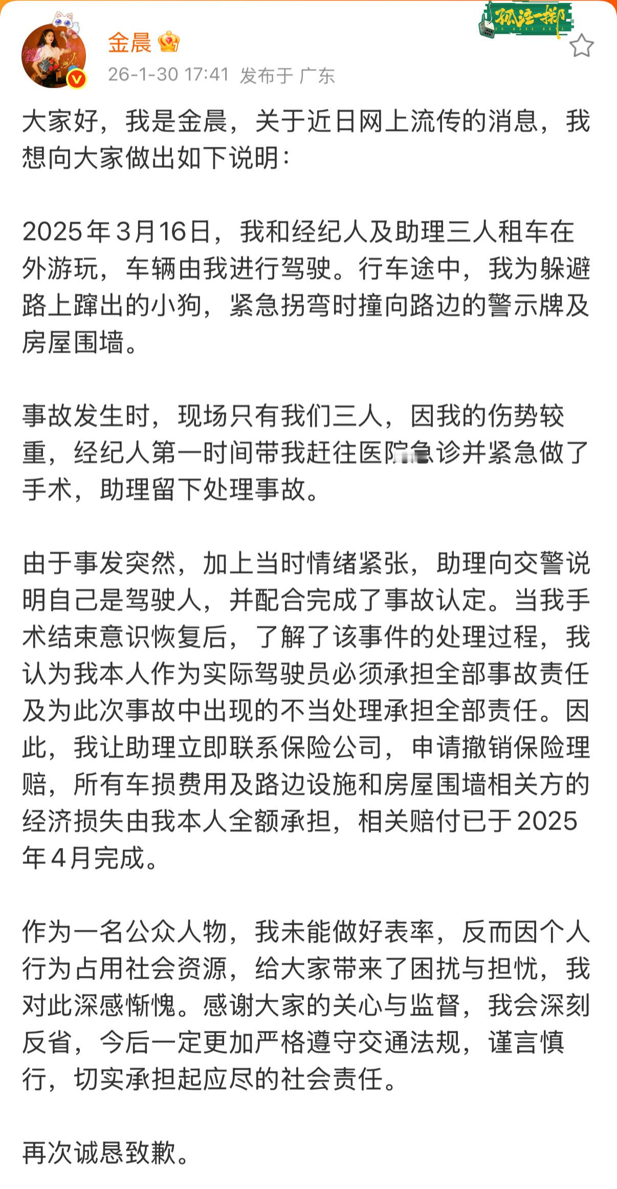 警方通报金晨事件 这几天一直悬着的心,终于放下了。金晨今天把事情来龙去脉说清楚了。事故是为躲避小狗发生的,她本人是实际驾驶员,也主动承担了全部责任和赔付,没有回避、更没有推诿。犯错不逃避、结果不甩锅,这份坦诚和担当,值得尊重。希望这件事到此为止吧……