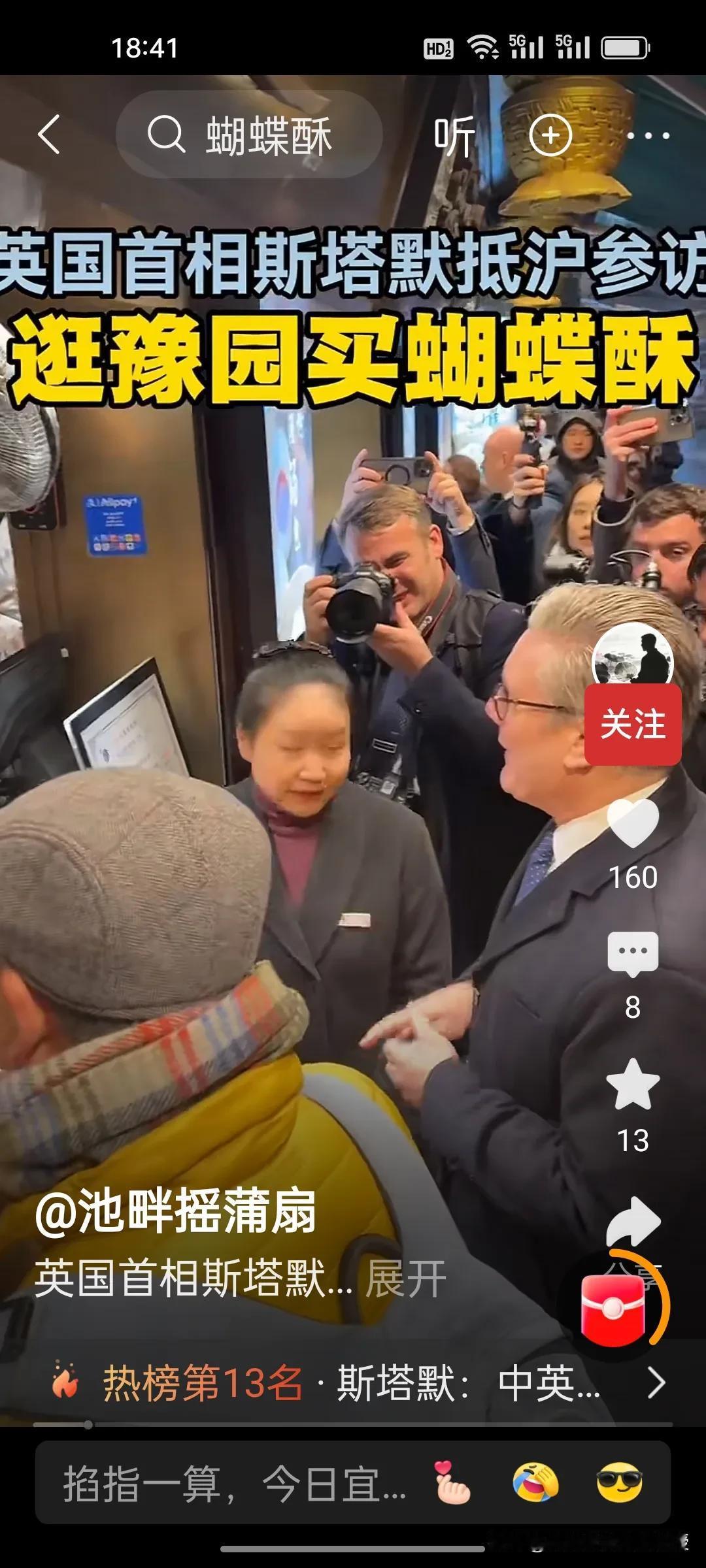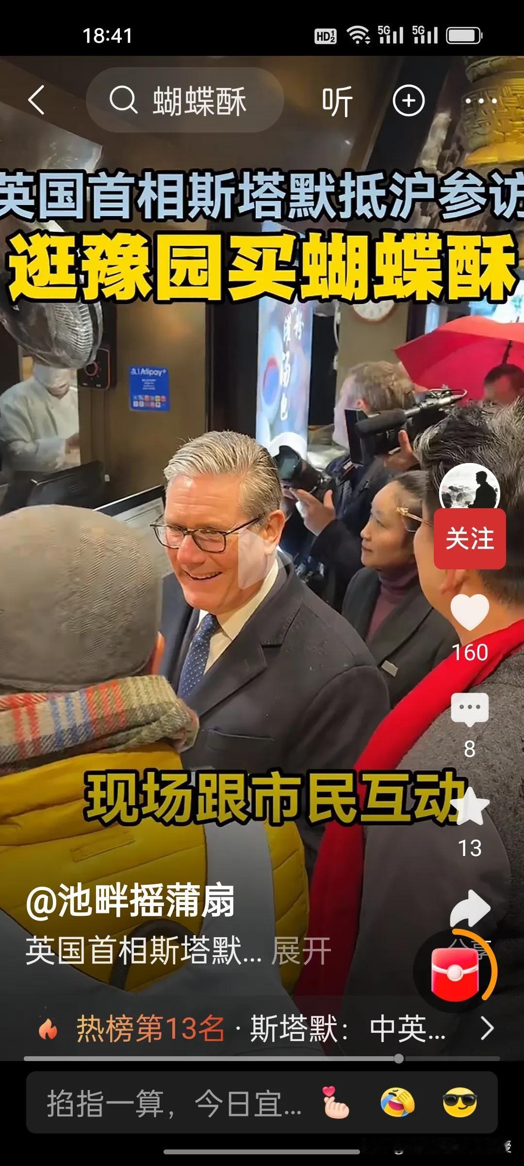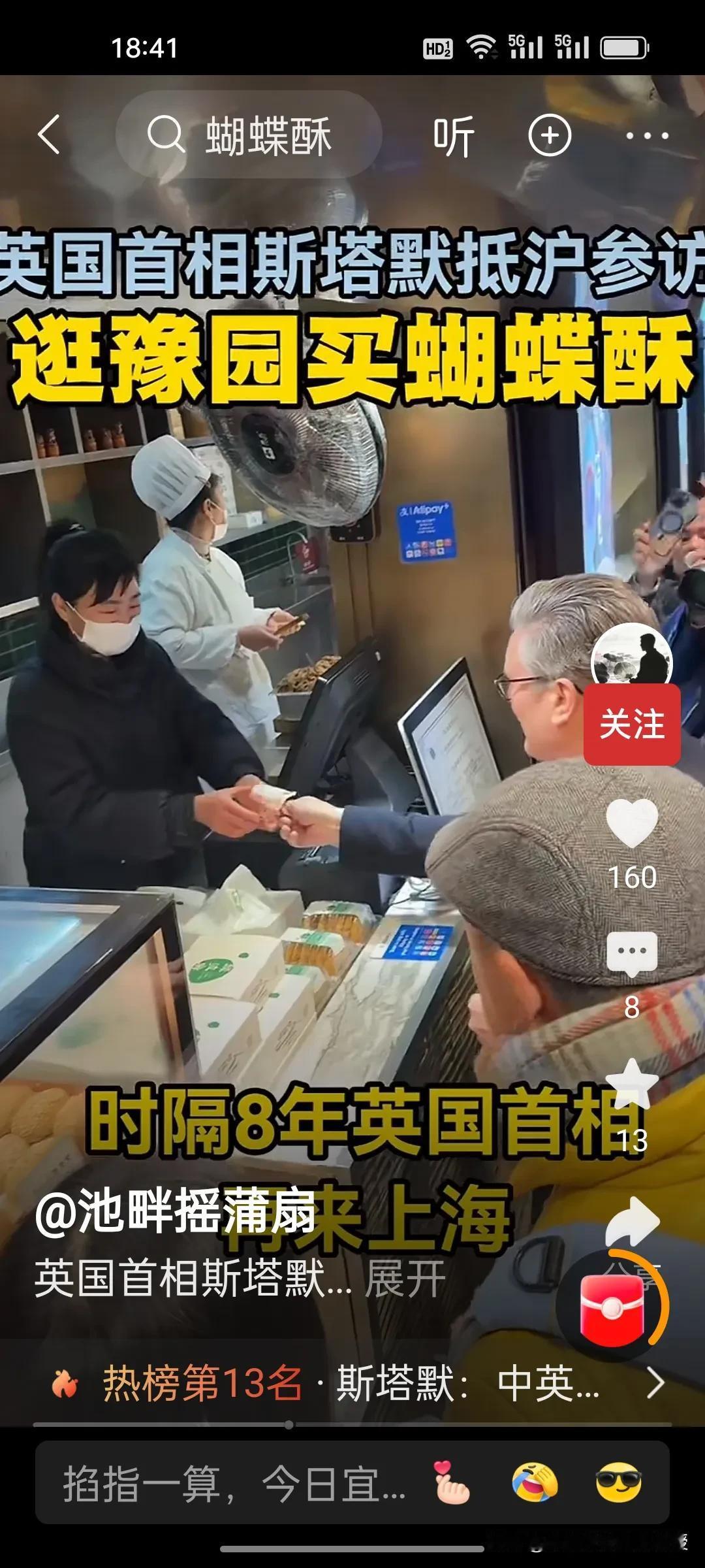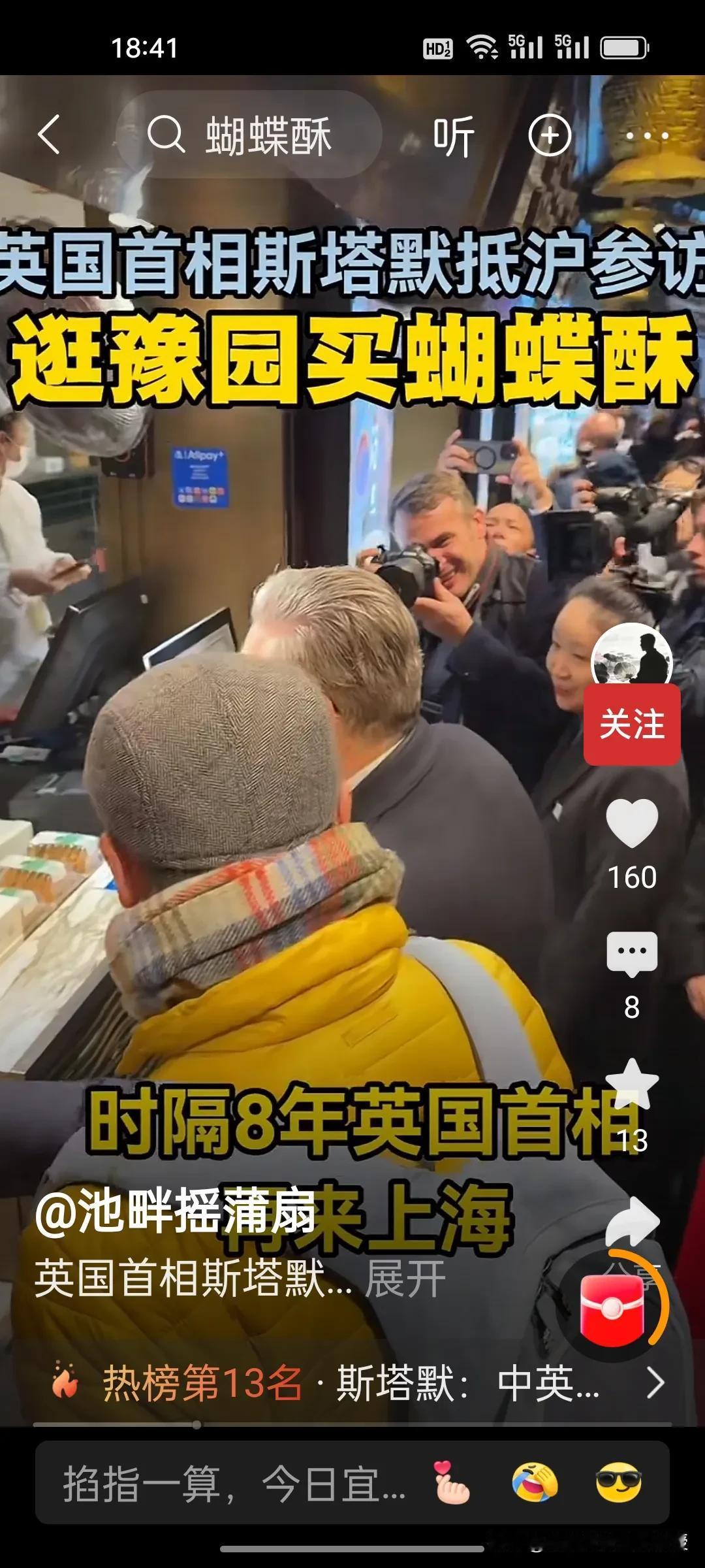 斯塔默来中国前绝对是把北京上海好吃的都提前做过功课了!从北京的“一坐一忘”云南菜吃到上海蝴蝶酥。斯塔默今天冒雨逛上海豫园,接着去了一家网红店买蝴蝶酥,他掏出一百元人民币买蝴蝶酥时,还跟周围的市民热聊,不知道斯塔默周围是不是他带的几位英国摄影师,一直在拍斯塔默和市民交流的照片,回去还不得好好宣传一番斯塔默亲民度满分啊!
