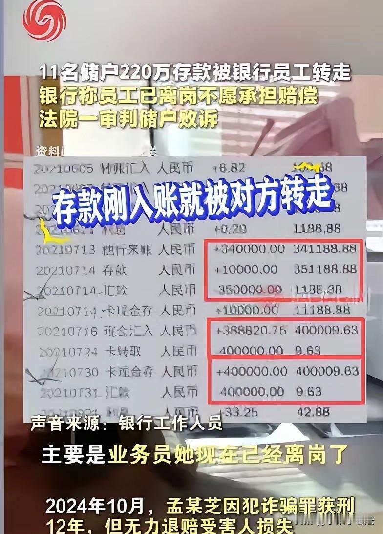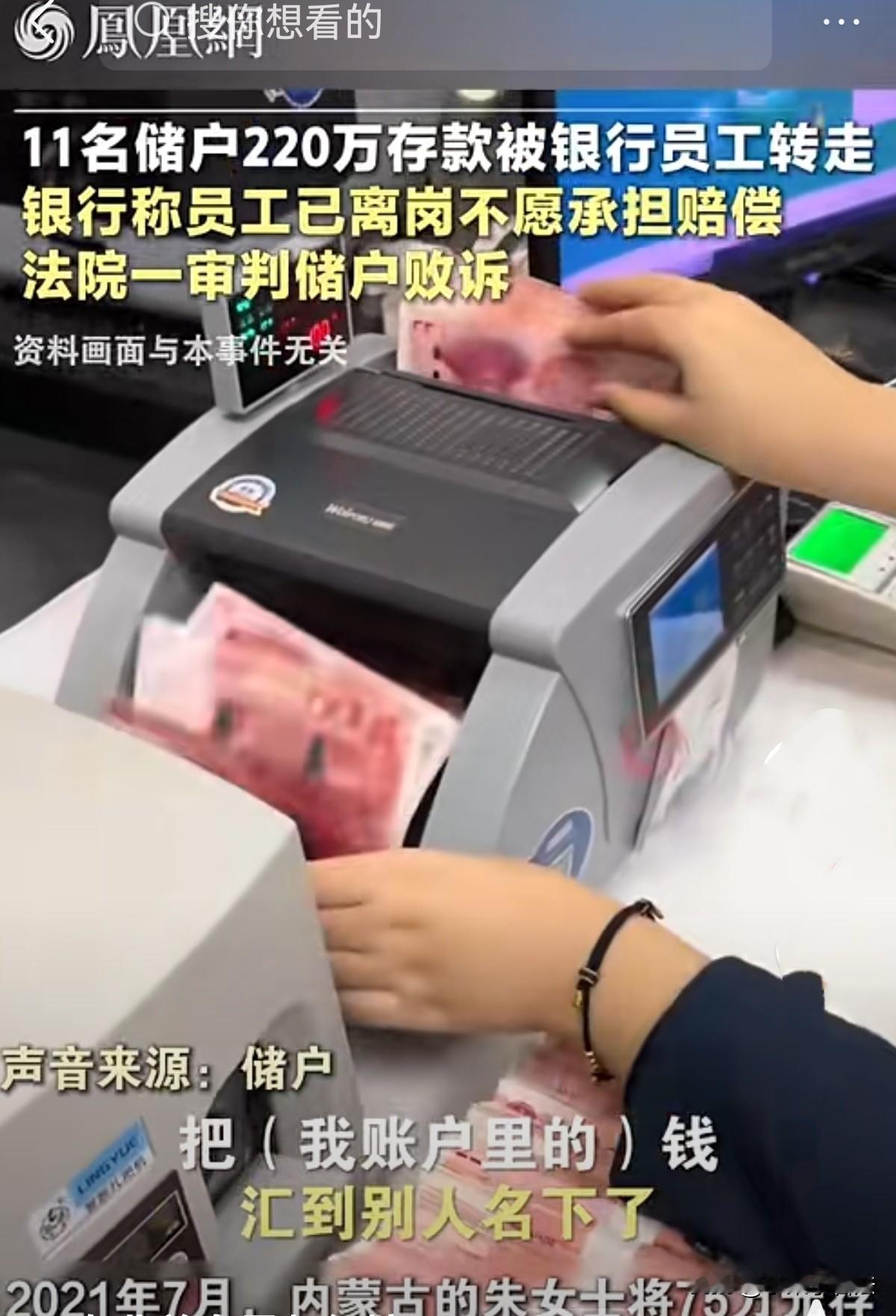 内蒙古呼伦贝尔,女子去银行在窗口存了75万,竟遭遇了一场精心策划的骗局。钱被柜员随后转走,她却一无所知,等她发现找到银行讨说法时,银行表示,那个柜员已离职。女子四处维权方知受害人有11人,一共被转走220万,女子以为起诉银行能追回自己的钱,谁知结果让她傻眼了! 朱女士遭遇了件堪称离谱的糟心事,直到现在回想起来依旧满心委屈与愤怒。她把一辈子的血汗钱老老实实交到银行柜台,最后竟落得钱凭空消失的下场? 朱女士手里的75万,是她大半辈子起早贪黑、省吃俭用攒下的积蓄。 平日里她非常会过日子,连一件贵点的衣服都舍不得买,买菜都要跟商贩讨价还价,她就想着手里存下钱,到老了才有底气,万一有个变故或状况,有钱心里不慌。 在她的认知里,银行是最安全的地方,把钱存进银行,就等于给财产上了一道最牢靠的锁。 2021年7月,她揣着这笔钱来到离她家最近的银行网点,在人工窗口办理存款业务。 办理过程中,柜员孟某芝全程热情引导,一步步告诉朱女士该签字、该提交哪些材料。 朱女士对银行业务一窍不通,每次来银行都是完全听从专业人员的安排。 这次还是,孟某芝让她给身份证她就给身份证,让签字就签字,她信任银行就信任工作人员,专业人做专业事,一切交给他们就好了。 孟某芝柜台里熟练地敲击键盘、整理单据,朱女士啥也看不明白,就坐在凳子上看她忙乎。 手续办妥的那一刻,朱女士长舒一口气,钱全部进了自己的小金库!她拿着回执单,安心地回家了。 然而,她丝毫没有察觉,一场精心策划的骗局,已经在她不知情的情况下完成了。 直到几天后,朱女士无意间查询账户余额,才发现账户里空空如也,那75万巨款,竟被转到了陌生的他人账户。 朱女士当场腿都软了,脑袋里一片空白,她攥着手机反复核对信息,一遍遍告诉自己是系统出错了,可冰冷的查询结果,狠狠击碎了她的侥幸。 她疯了似的赶回银行,追问钱的去向,得到的答案却让她心凉半截:这笔钱,是当时为她办理业务的柜员孟某芝私自转走的。 更让朱女士气愤的是,银行工作人员轻飘飘地丢下一句,孟某芝已经离岗了,言外之意,此事与银行再无关联。 朱女士当场就红了眼,孟某芝是银行的正式员工,是在工作时间、工作岗位上,利用职务之便转走了她的钱。 银行一句员工离岗,就想把所有责任推得一干二净,这让她无论如何都无法接受。 随着朱女士报警并四处维权,更多受害者陆续站了出来。大家一统计才发现,被孟某芝用同样手段坑骗的储户,足足有11人,涉案总金额高达220多万元。 这些钱,都是每个家庭的养老钱、救命钱,被孟某芝挥霍得一干二净。 2024年10月,孟某芝因诈骗罪被判刑12年,法律给了她应有的惩罚,可她早已身无分文,根本没有能力退还赃款。 看着自己一辈子的积蓄打了水漂,朱女士和其他受害者不肯认命。她们坚信,银行对员工监管存在严重漏洞,才让孟某芝有了可乘之机,银行必须为储户的损失负责。 抱着最后一丝希望,朱女士将涉事银行告上了法庭,要求兑付本金与利息。 她本以为,自己占尽道理,法院一定会为她主持公道,拿回自己的血汗钱。 可庭审结果,给了朱女士当头一棒。 一审判决下来,她竟然败诉了。 这个消息如同晴天霹雳,让朱女士彻底陷入了绝望。 她坐在家里,看着空荡荡的房间,一想到那75万就止不住流泪,无数个夜晚辗转难眠。 但看着同样维权无门的其他受害者,想到自己大半辈子的辛苦付出,朱女士咬了咬牙,她不甘心就这么认输。 哪怕前路再难,她也要继续上诉,一定要为自己讨回一个公道。 2026年1月5日,朱女士案二审开庭,尚未宣判。 但同系列案件另1名储户二审已胜诉,给她了希望与力量,这场关乎血汗钱的维权之战,还远远没有结束。 您认为这钱银行应该负责吗?