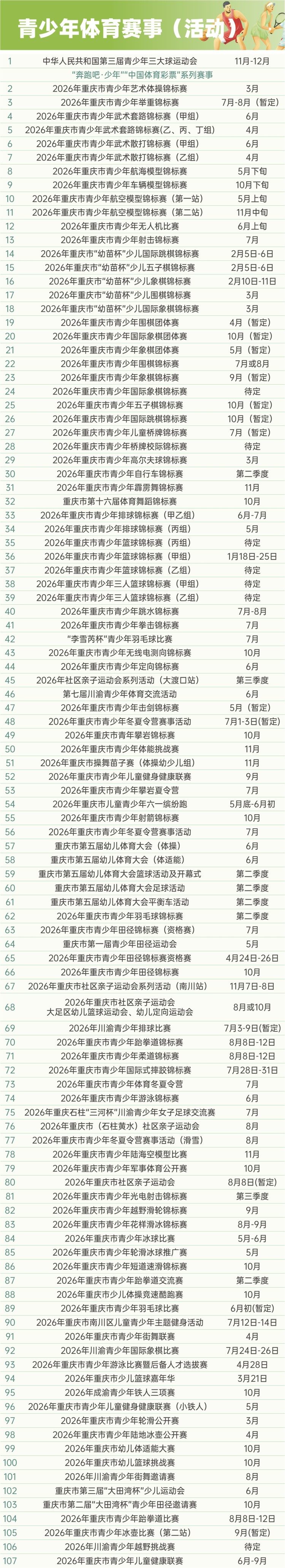 青少年体育是体育事业发展的重要基础。2026年,重庆将做精做强“奔跑吧·少年”系列活动,举办重庆六一缤纷跑、重庆市幼儿体育大会等适合青少年参与的体育文化活动,高水平筹办第三届全国青少年三大球运动会,积极探索区域特色青少年赛事,激发青少年运动兴趣,夯实体育后备人才基础。