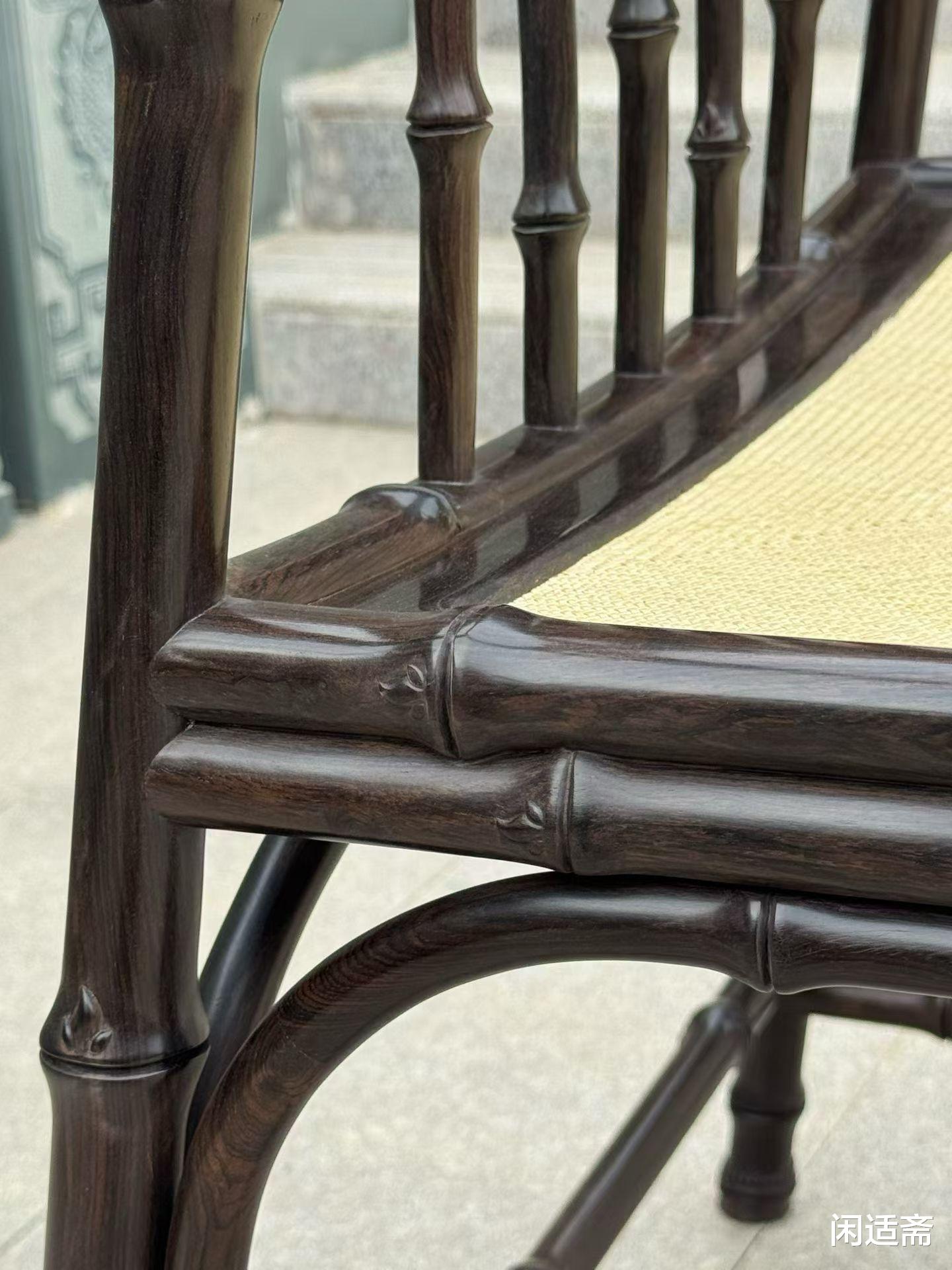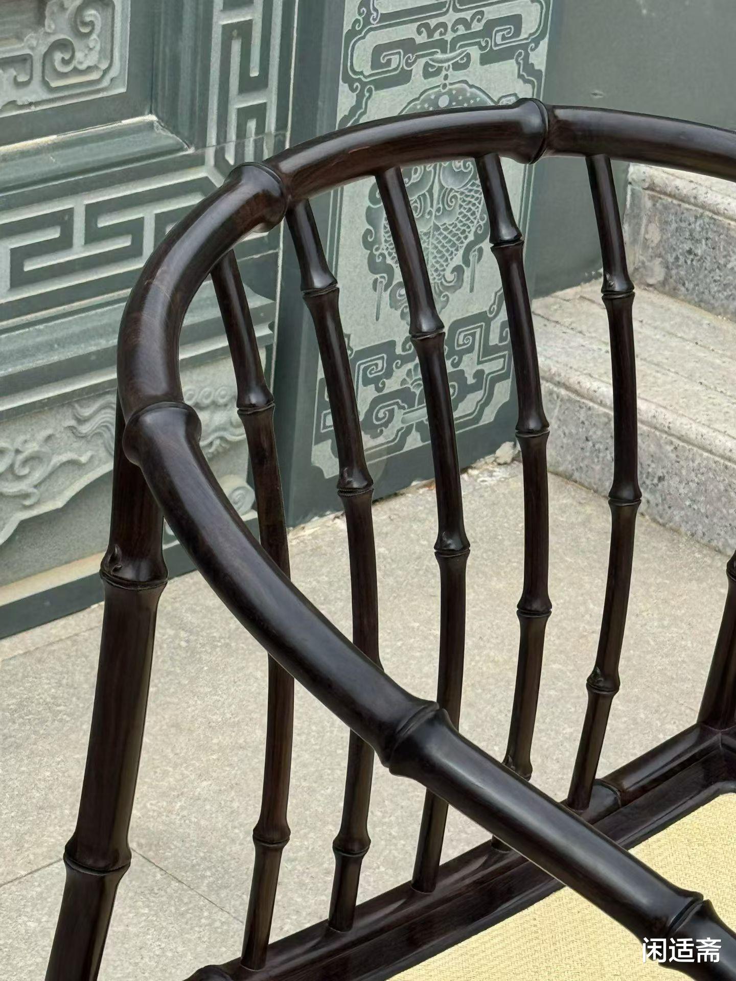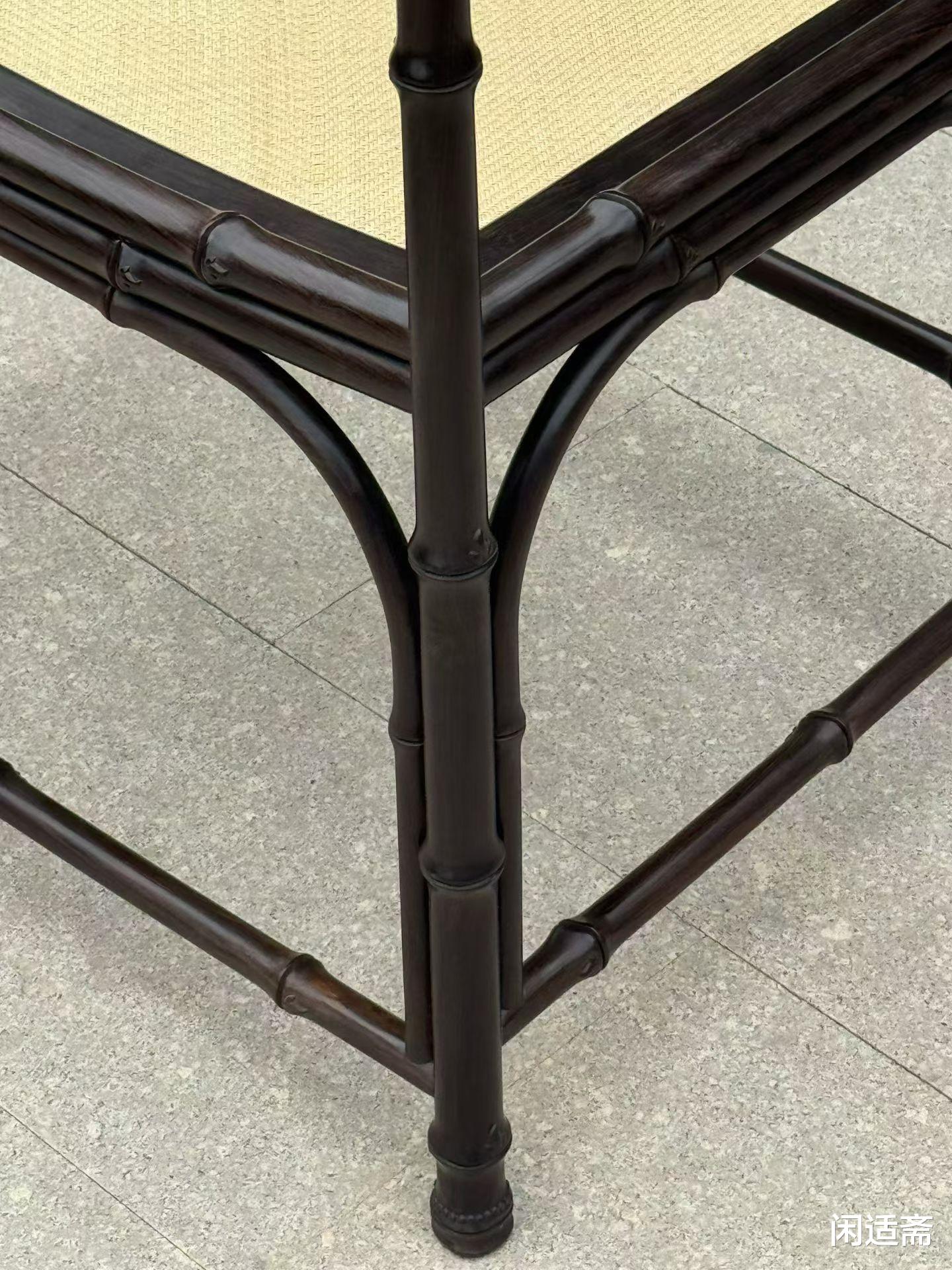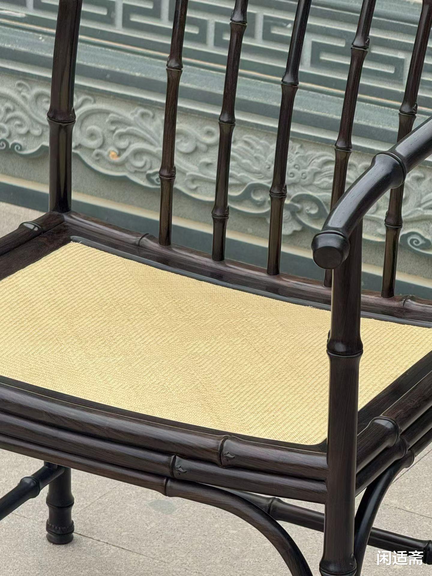 竹节形制,藏尽君子风骨。椅身通体融入竹节元素,复刻天然竹节的挺拔肌理,线条流畅自然,细节惟妙惟肖——圈椅扶手呈圆润弧形,仿竹节生长之势,婉转柔和,贴合手臂弧度,倚靠舒适;椅腿、立柱均雕饰竹节纹路,一节一节错落有致,既还原了竹子的天然美感,又将竹子“有节有度”的君子内涵具象化,摒弃繁复雕饰,以简约素净彰显雅致,完美契合东方美学“重意轻形”的格调。