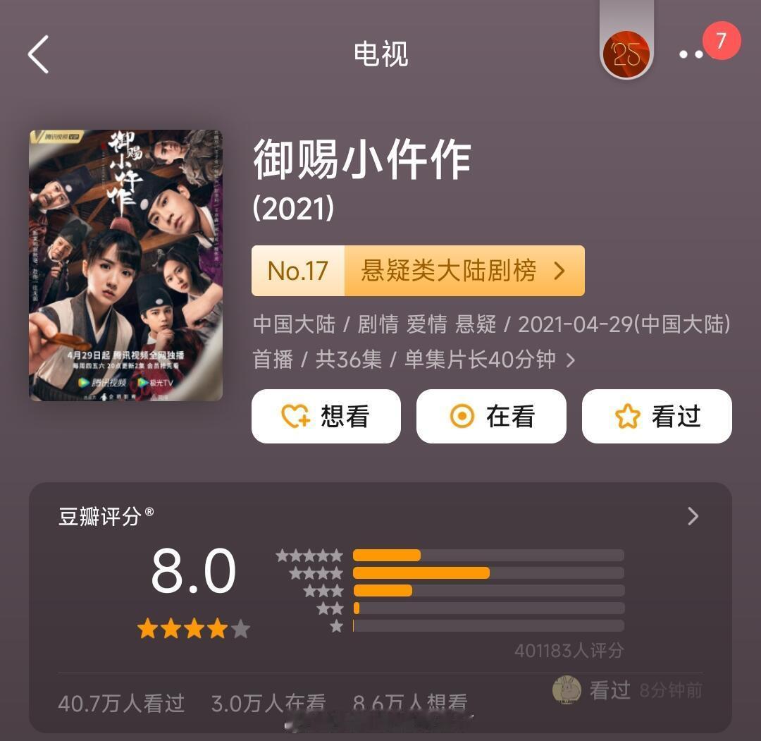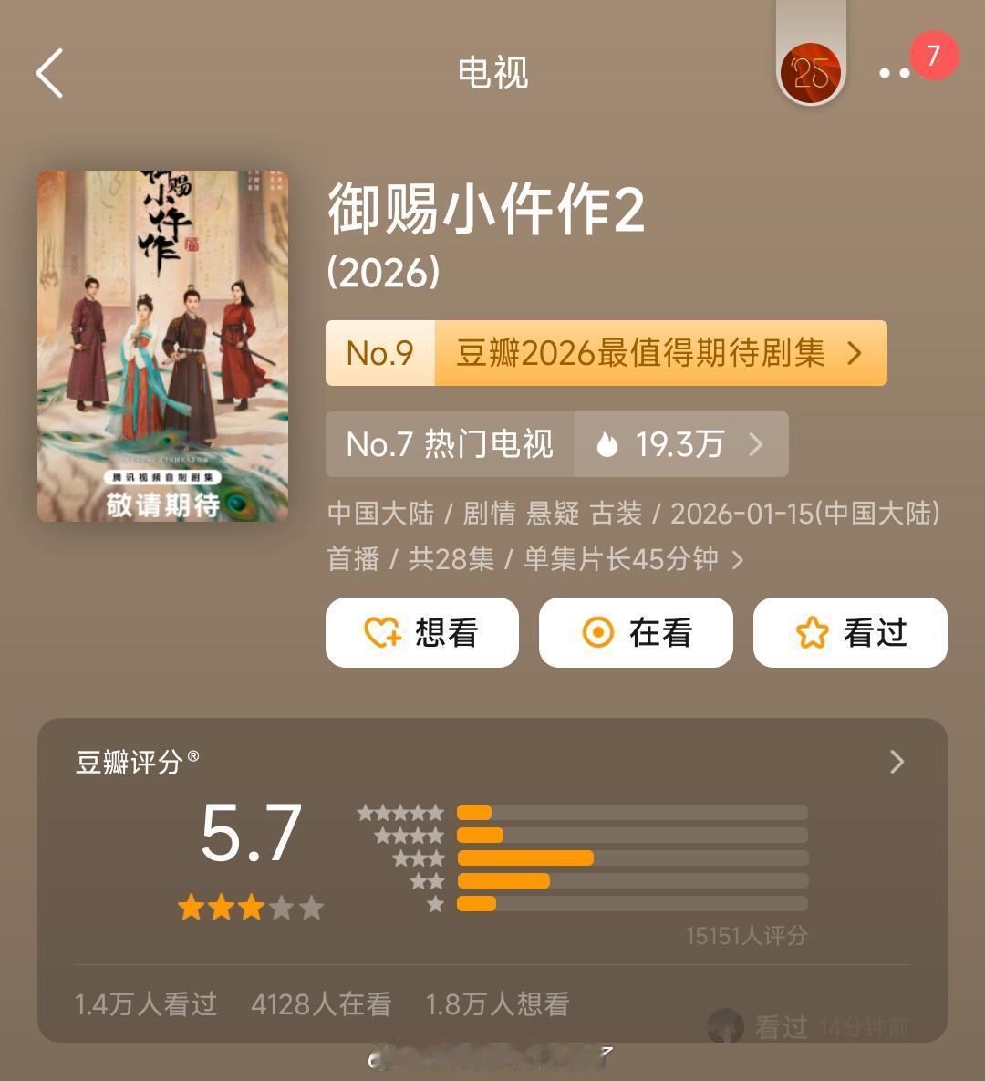 《御赐小仵作2》豆瓣开分5.7分,打分人数1.5w+,第一季8.0分苏晓彤一番王
