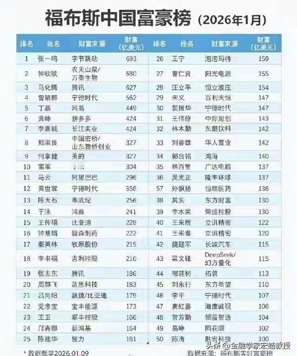 最新的福布斯中国富豪排行榜来了!雷军304亿美元身价超越马云296亿美元,跻身前十。 85后的陈天石排在第13位,成为最富有的85后创业者,紧随其后的王宁排在26位,梁文锋则以115亿美元身价排在第43位。 80后张一鸣以693亿美元位列第一,超越680亿美元身价的钟睒睒,这已是钟睒睒近年第三次被后起之秀超越。 从这份排行榜也不难看出,从张一鸣到陈天石,新经济力量正在重新定义财富格局,这不仅是榜单的变化,更是中国商业代际交替的缩影。