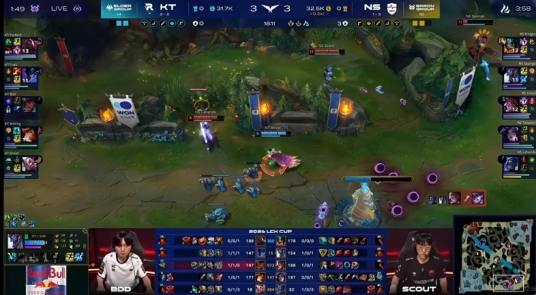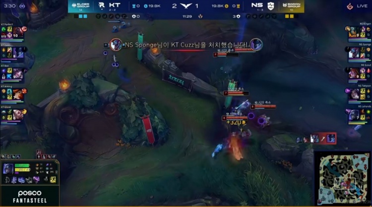 [17:10]视野优势,NS再拿听牌风龙!随后Lehends慎大招包下,配合队友一起越塔强杀Bdd辛德拉!KT只能换掉峡谷先锋!NS随后还连吃中路一塔镀层,经济领先2K!
