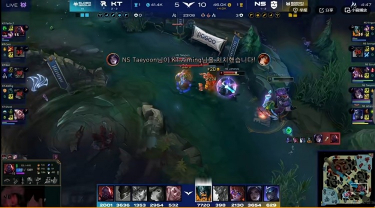 [20:35]河道KT关灯强开,费劲九牛二虎之力强杀Taeyoon卡莎!但是Kingen奥拉夫绕后切死开大的Aiming女枪,残局NS再留KT野辅!又是一波1换3!