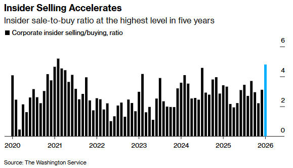 华盛顿服务公司汇编的数据显示,本月约有6000家美国上市企业中,近1000名高管减持了公司股票,而增持者仅为207名,由此产生的卖出/买入比率达到五年来的最高水平。