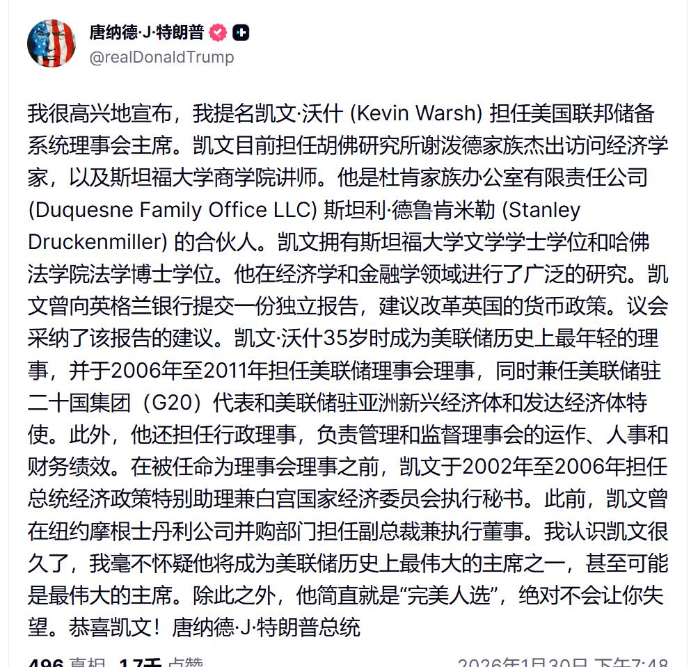 北京时间1月30日晚间,美国总统特朗普在其TruthSocial平台发文称,他打算提名凯文·沃什(KevinWarsh)出任下一任美联储主席。