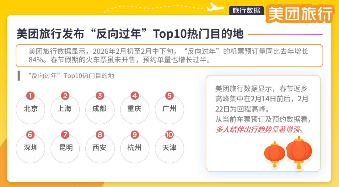 好多年以来,每逢过年,都是远在家乡的老人早早把各种好吃的准备好,在家一天天数着日子,盼望着在外的儿女们早些回家过年,一家人好围坐在一起,其乐融融。 然,近两年这种现象发生了改变,传统“子女返乡”的单向团圆格局被打破,越来越多家庭告别同质化年味,或接长辈团圆,或与亲朋好友奔赴他乡,在多元文化场景中解锁差异化春节体验。 “反向过年”热潮持续走高,已然成为当下春节的新趋势。 所谓的反向过年是指父母在春运期间前往子女工作城市过年的社会现象,与传统的子女返乡形成逆向流动。该现象缓解了春运单向运输压力,促进城乡文化融合,被专家视为城乡新年俗融合的开端。 值得一提的是,在“反向过年”热潮中,美团旅行默默奉献着爱心。据数据显示,2026年春运期间,“反向过年”的车票预订量增长明显。 2月初至2月中下旬,“反向过年”的机票预订量同比增长84%。从机票的预订情况看,“反向过年”排名前十的热门目的地为北京、上海、成都、重庆、广州、深圳、昆明、西安、杭州、天津。 与此同时,美团旅行交通业务持续引入更多优质的机票供给,并联合航司为55岁及以上的乘客提供全流程的免费引导服务,助力更多家庭团圆。 反向过年