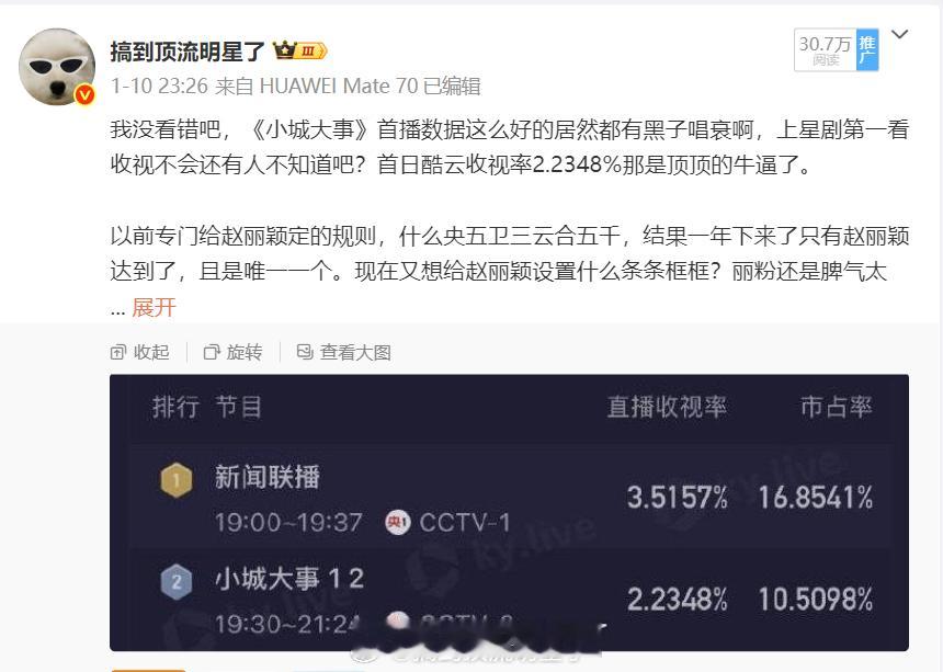 赵丽颖《小城大事》两集首播酷云均值2.23%、峰值 2.63%、开播10分钟酷云破2、15分钟登顶全频道第一的含金量