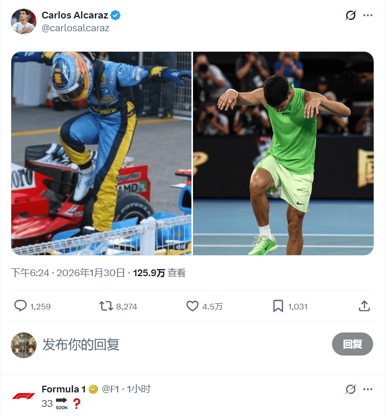 虎扑01月30日讯奋战五个半小时打进澳网决赛后,卡洛斯-阿尔卡拉斯在社交媒体平台分享赛后致敬西班牙F1车手、偶像费尔南多-阿隆索的庆祝动作的照片。