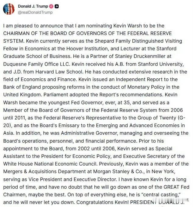 特朗普提名凯文沃什担任美联储主席【美国总统特朗普提名前美联储理事凯文·沃什担任美