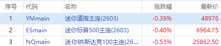 特朗普盘前宣布凯文·沃什将出任美联储主席,美股三大期指周五集体走低,纳指期货$NQmain跌0.40%,标普500期货$ESmain跌0.53%,道指期货$YMmain跌0.39%。