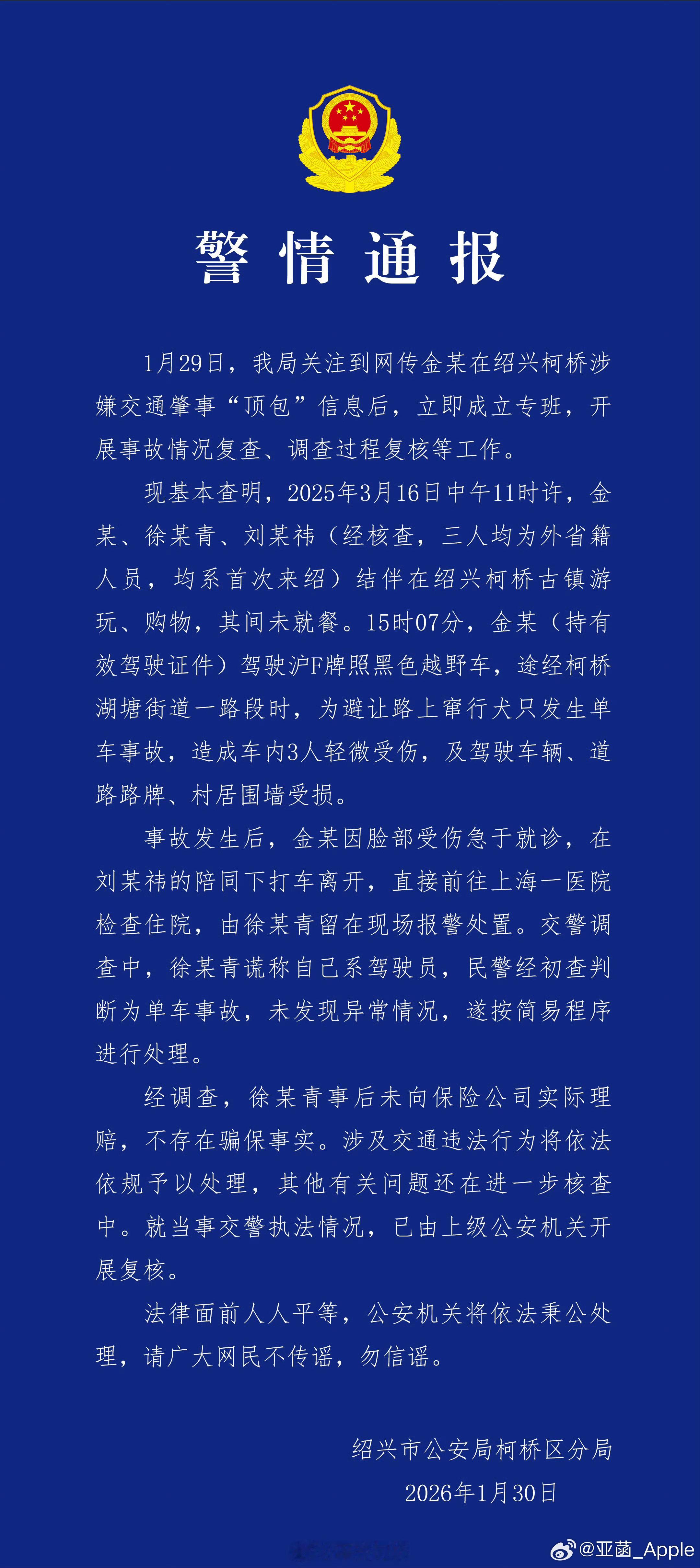 3、助理和交警撒谎说是她开的车,但助理并没有向保险公司申请走保险,不存在骗保的说法。警方的通报和狗仔的爆料出入还是挺大的,特别是骗保这一点,狗仔说的言之凿凿,说金晨骗保,但事实上金晨并没有骗保,所以狗仔在这上面造谣了。