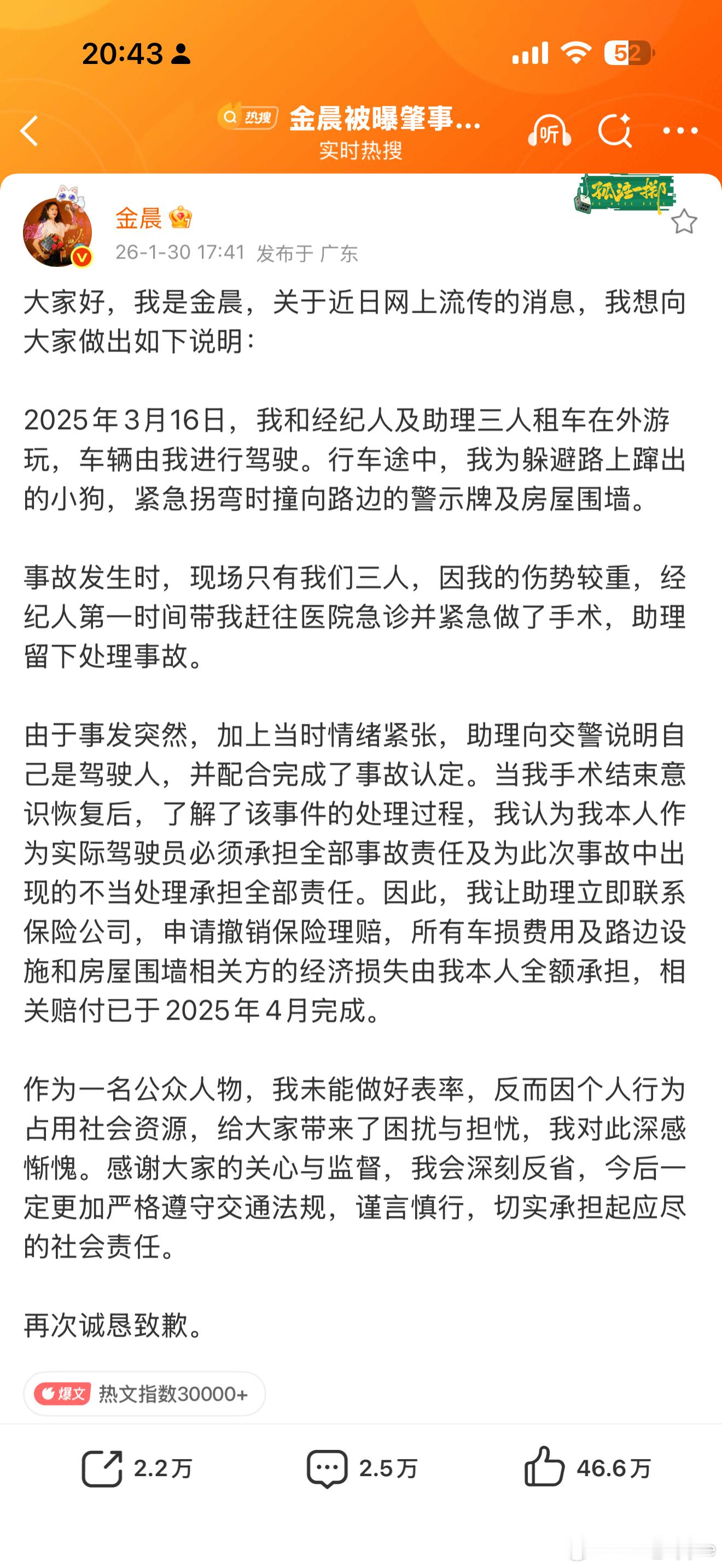 1、开车的人的确是金晨,但出车祸的原因并非是酒驾,而是马路上突然窜出了小狗,金晨为了避免撞到小狗,所以撞上了路边的居民房围墙。