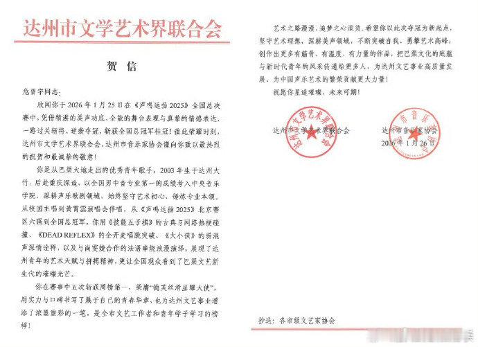达州文联给危晋宇夺冠发祝贺信 从巴渠少年到全国冠军,危晋宇用一路稳扎稳打的表现征服舞台,家乡文联的贺信,是肯定,更是全体达州人的骄傲与期盼。声鸣远扬