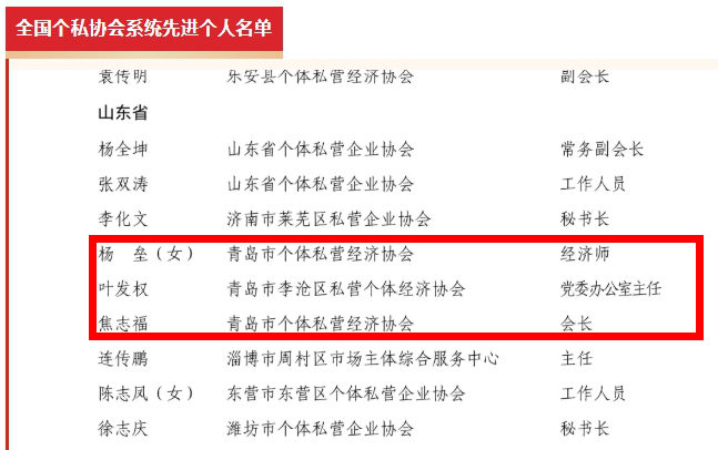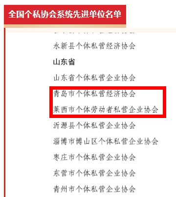 我市个体工商户周相珍、董永玲两人荣获“全国先进个体工商户”称号,青岛市个体私营经济协会、莱西市个体劳动者私营企业协会荣获“全国个私协会系统先进单位”称号,杨垒、叶发权、焦志福荣获“全国个私协会系统先进个人”称号,生动彰显了我市个体私营经济的蓬勃生机与个私协会系统的昂扬风貌。