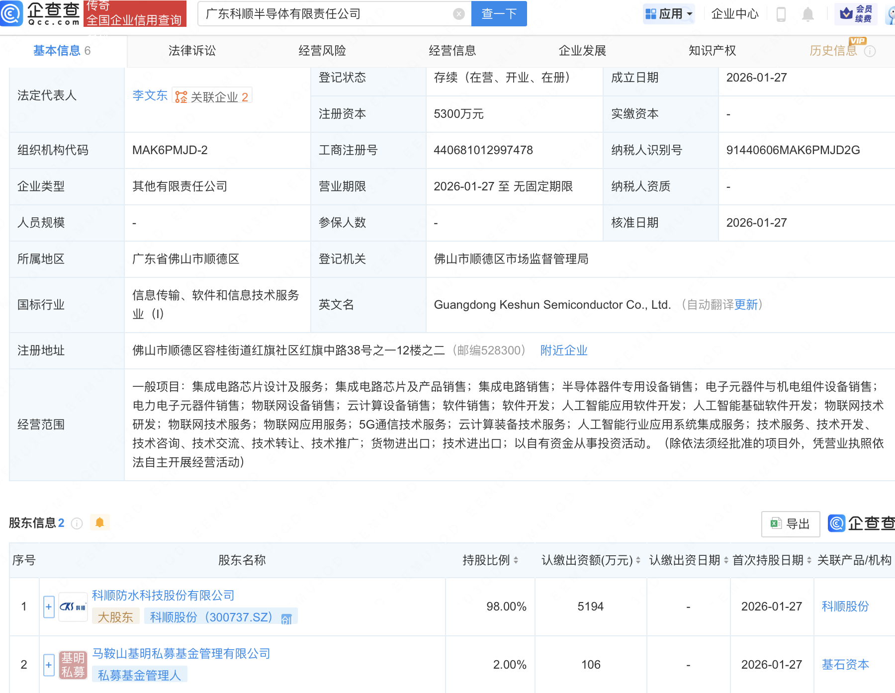 企查查APP显示,近日,广东科顺半导体有限责任公司成立,注册资本5300万元,经营范围包含:集成电路芯片及产品销售;半导体器件专用设备销售;人工智能应用软件开发;人工智能基础软件开发;物联网技术研发等。企查查股权穿透显示,该公司由科顺股份(300737)等共同持股。