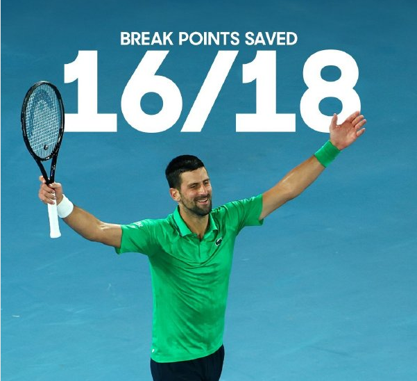 据统计,全场比赛,德约科维奇本场比赛挽救了16个破发点,为个人职业生涯在澳网挽救破发点第二多比赛。