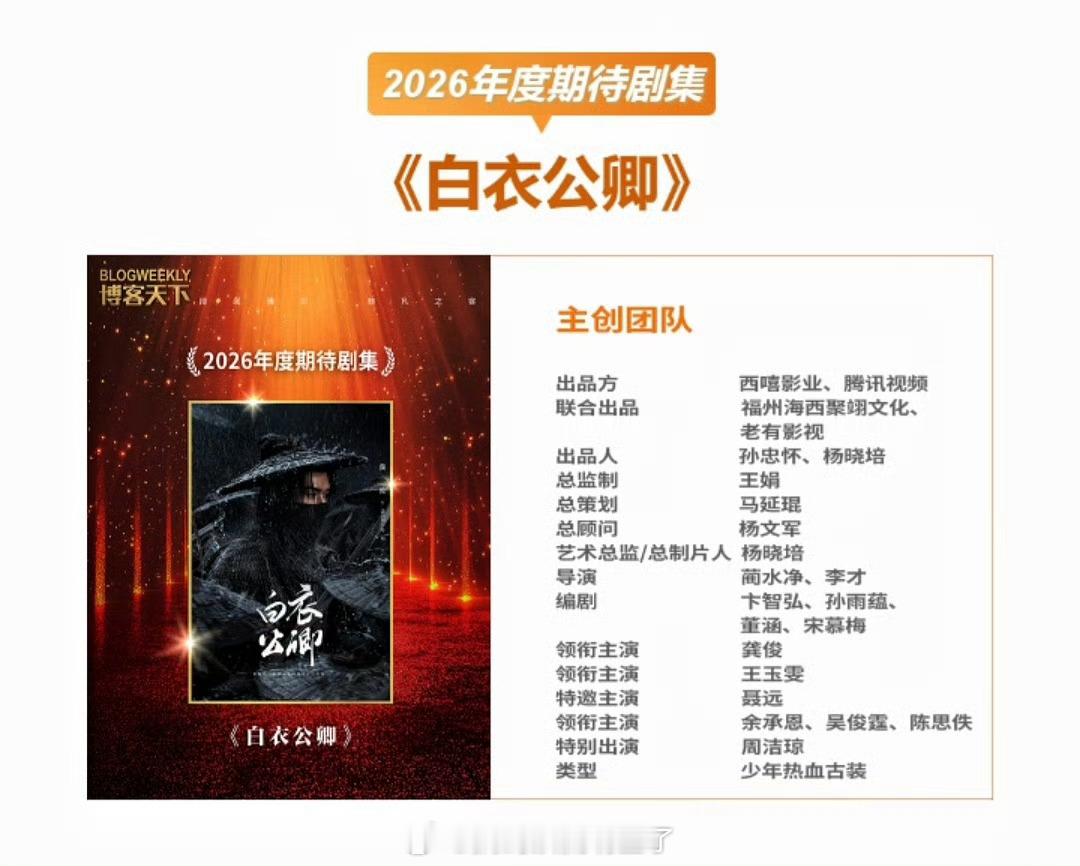 恭喜龚俊一番武侠大男主剧《白衣公卿》获得博客天下2026年度期待剧集🎉🎉🎉这已经是数不清的第几个年度期待剧集了,龚俊出品必属精品,一定要早日播出啊,好想看白衣公卿