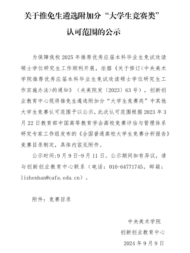 又是一年央美保研季,最近陆陆续续也收到了很多学弟学妹们的询问,很高兴自己去年的保研经验帖子能帮助到大家,今年政策大改哦!依旧是定时更新一些关于保研的政策改变方案🎓变天了……怎么一看有84个能加分的课外比赛?还不算校内的获奖(我怎么记得我去年就3个4个认可加分的课外大比赛呢😧)