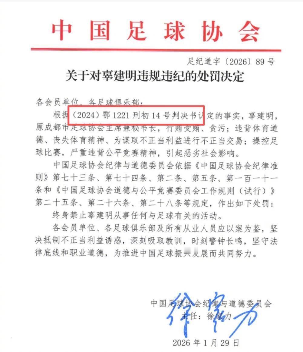 昨日,中国足协公布对“假赌黑”涉案人员处罚结果,根据(2024)鄂1221刑初14号判决书,原成都市足协主席辜建明被处罚终身禁足。
