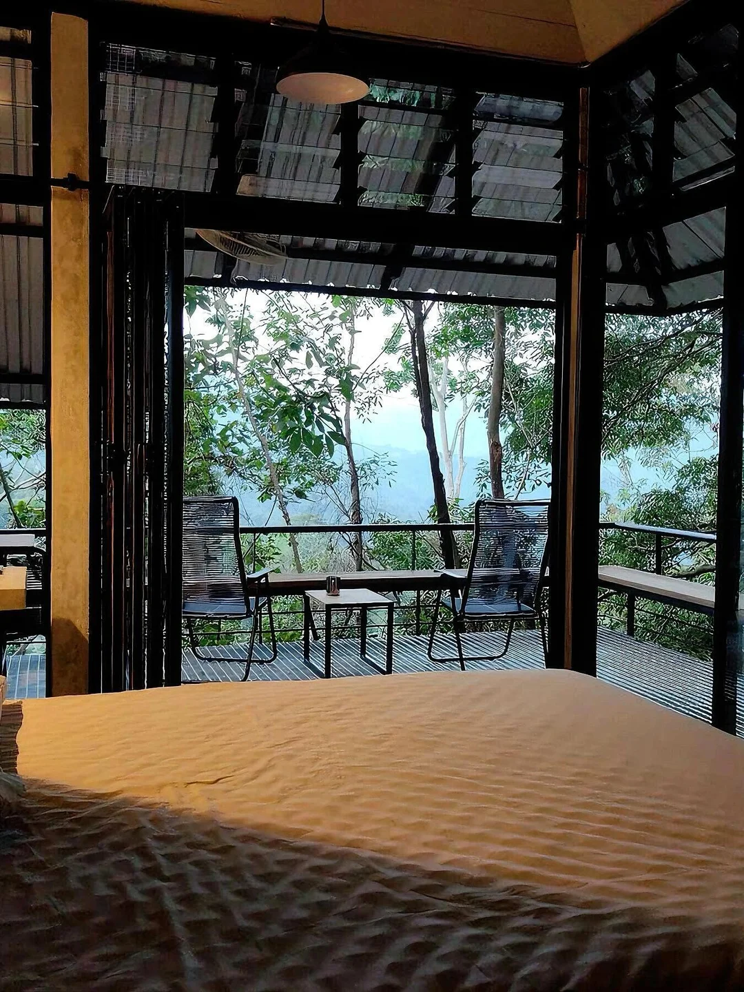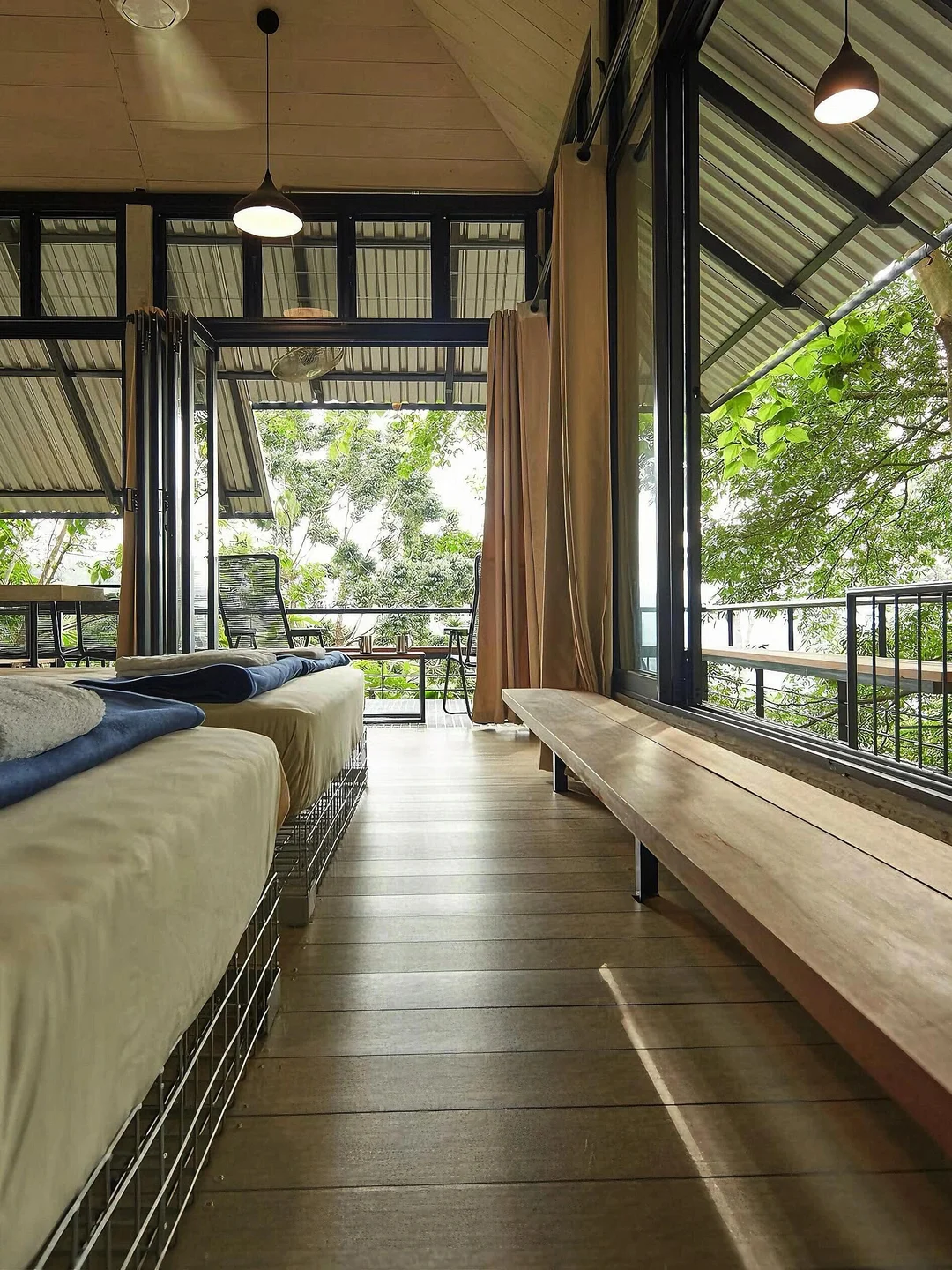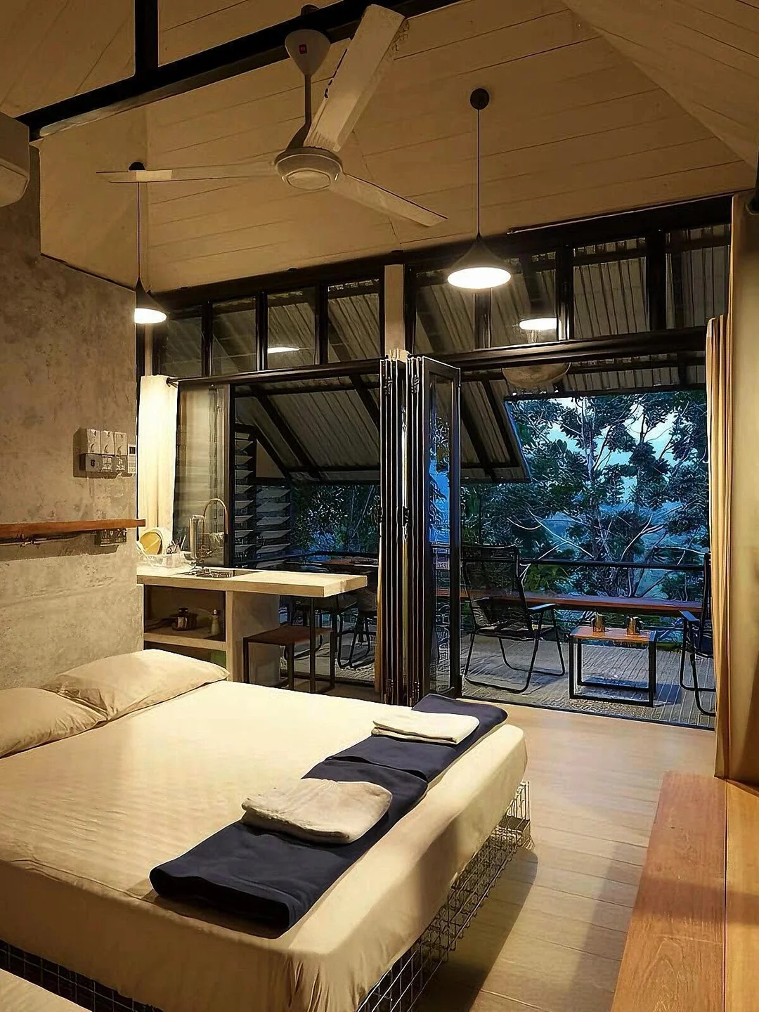民宿的位置非常特殊,是一间藏在森林中的工业风别墅,周围全是茂密的树林,简直就像是一个隐藏的世外桃源,房间内的露台非常惬意,有长长的椅子供人休息,露台连接着卧室,房间内采光又好又宽敞,早上能起来看日出,傍晚的时候又能在山里看日落~