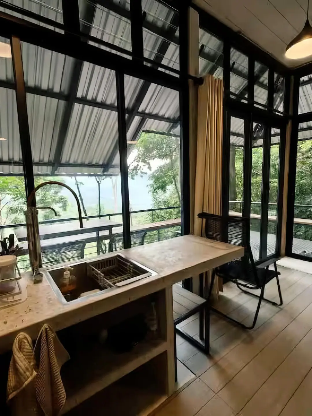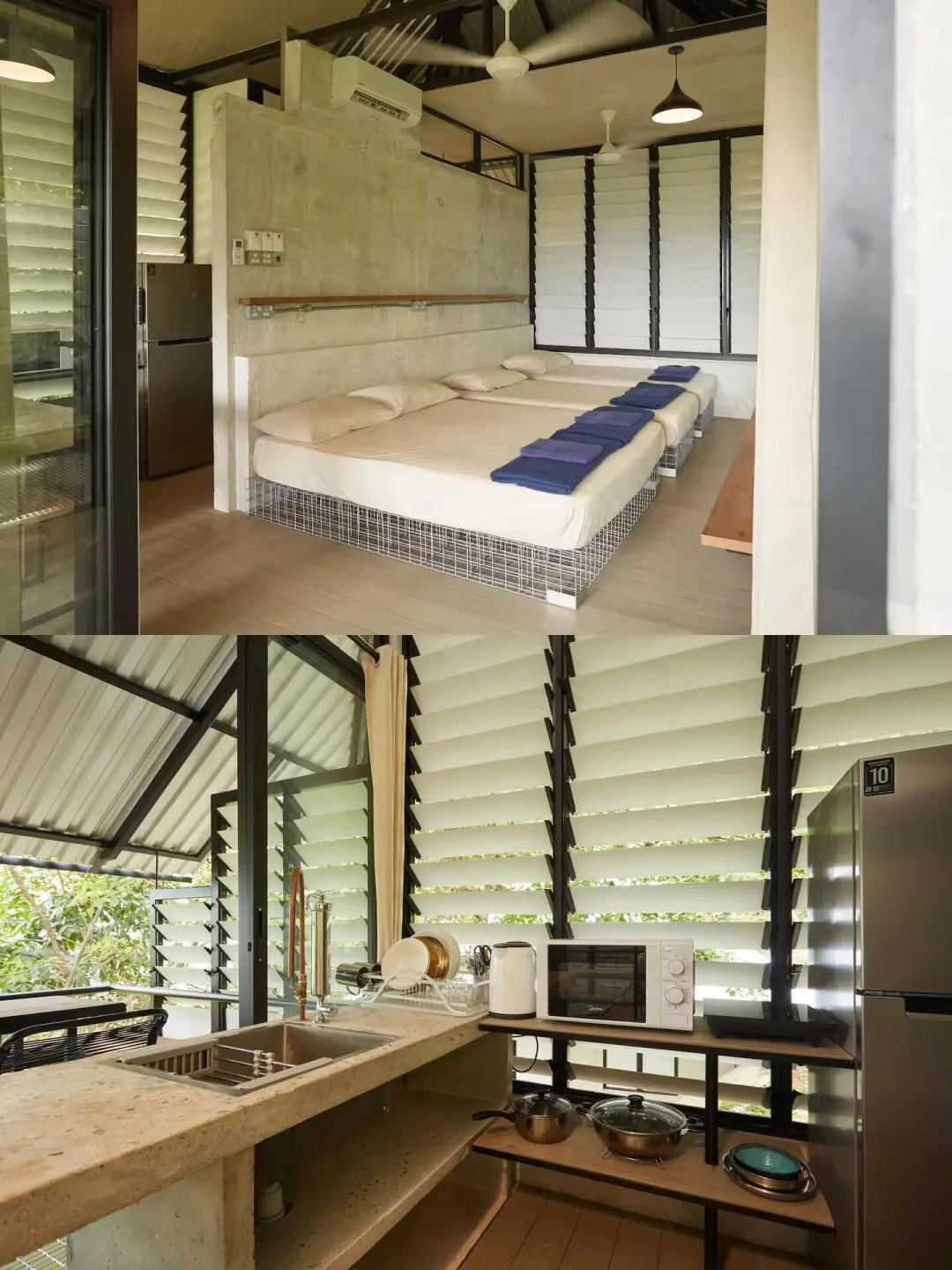虽然藏匿在山中,但是房间内的生活设施准备的很充足,浴室内有热水淋浴和洗漱用品,户外还有一个超大泳池,原始又自然,厨房内有炉灶和冰箱,可以自己买来食材做饭吃,房东还准备了烧烤工具,可以叫上朋友们一起bbq!