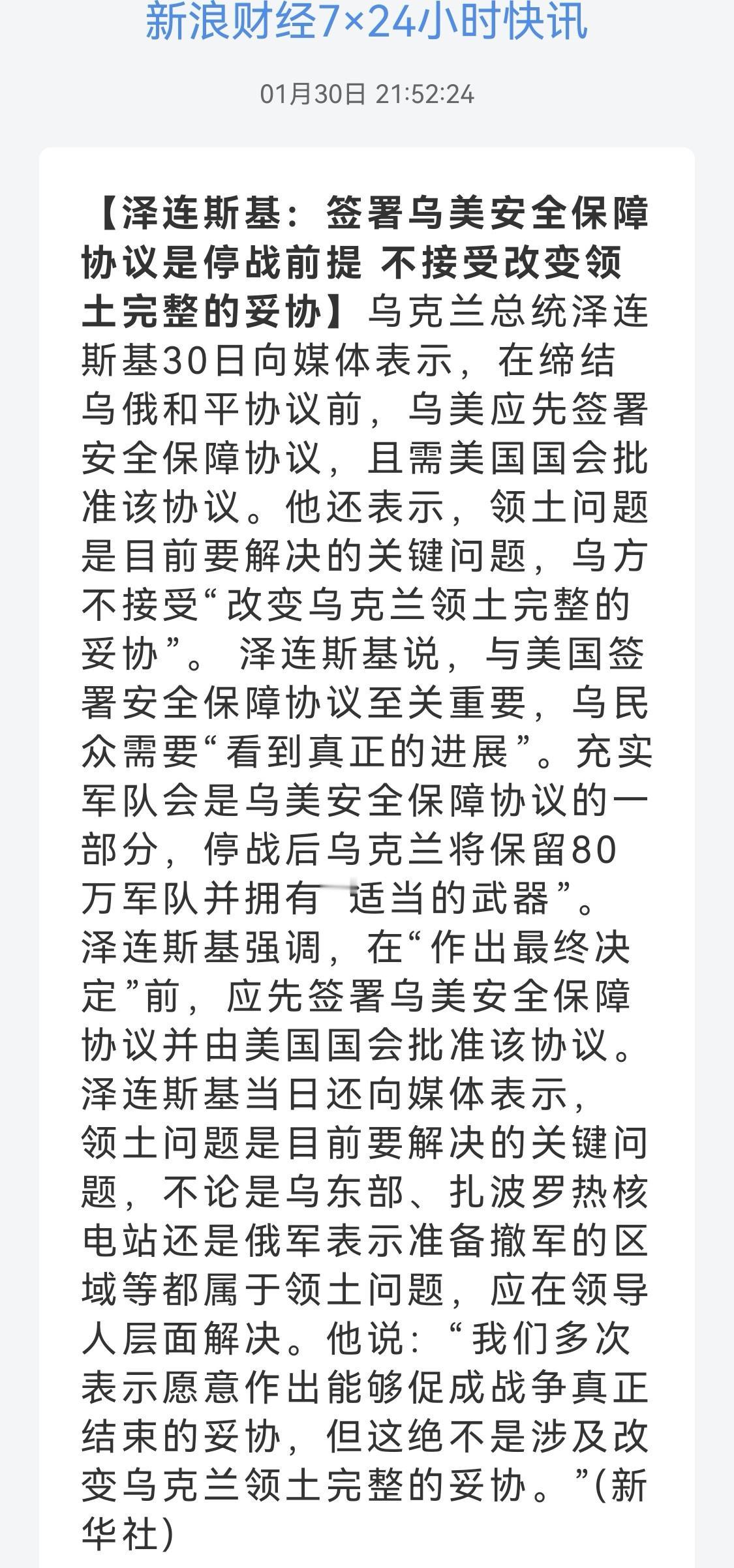 乌美裂痕 演员又耍把戏 梦想休整补充能量 俄乌和谈进展 俄乌 美乌和平谈判 你如何看待美俄乌三方会晤的前景 新华社报道,乌克兰总统泽连斯基30日向媒体表示,在缔结乌俄和平协议前,乌美应先签署安全保障协议,且需美国国会批准该协议。乌民众需要"看到真正的进展"。充实军队会是乌美安全保障协议的一部分,停战后乌将保留80万军队并拥有“适当的武器”。领土问题是目前要解决的关键问题,不论是乌东部、扎波罗热核电站还是俄军表示准备撤军的区域等都属于领土问题。他说:“我们多次表示愿意作出能够促成战争真正结束的妥协,但这绝不是涉及改变乌克兰领土完整的妥协”。领土问题又不愿意妥协了?又变了吗?难怪俄方继续加大打击力度。先看俄方态度: 俄外长表示:俄方对乌克兰发起特别军事行动近4年来,任何一次停火都被乌方用来补充武器和兵力,为乌方换取喘息之机积蓄力量继续对俄作战。俄方未见泽连斯基一直所称的俄乌“和平计划”文件,俄方认为,乌克兰和欧洲“大幅修改”美国提出的原版方案,并试图向美方兜售这份“和平愿景”。俄方又是怕他耍把戏,如果协议不牵扯领土,那么你补充一下武器和兵力又可以翻脸为了“正义”继续作战了。再看美方态度: 央视新闻报道,当地时间1月27日,知情人士称,美国已向乌克兰表示,只有与俄罗斯签署和平协议后,乌方才能获得美国提供的安全保障。美国安全保障被乌克兰视为结束俄乌冲突的核心条件。知情人士否认美方试图迫使乌克兰接受"割让领土"的说法。美方希望乌克兰与俄罗斯达成和平协议,内容包括乌克兰放弃顿巴斯地区。如果乌克兰同意,美将承诺提供更多武器支持。美国也看的明白,你都没有签署协议,我凭什么向你提供安全保障,还要求国会批准成为法律必须保护你,挖个坑让我和俄方直接对抗?这种事情哪是你一个三流演员能玩的高层次把戏? 美方态度,和平协议达成,才会有保障协议;泽连斯基把戏,先给我保障协议和资金繁荣计划,再签和平协议,而且“不涉及改变乌克兰领土完整”,而且还要武装你80万军队。那俩都是千年的狐狸,你跟美俄玩什么聊斋? 和平协议只要不涉及领土问题,俄方就不和你玩,先让美方给你批准保障协议?一个不可能有结果的议题?当美国国会都是傻子?和平协议只要不涉及领土,那么可以随时翻脸,美国给你保障一个“火药桶”干啥? 反正据说特朗普只帮你申请了一周,俄方不攻击能源基础设施的时间,我看真多余可怜他,继续演戏吧~ (图片源自网络侵权告知删除)