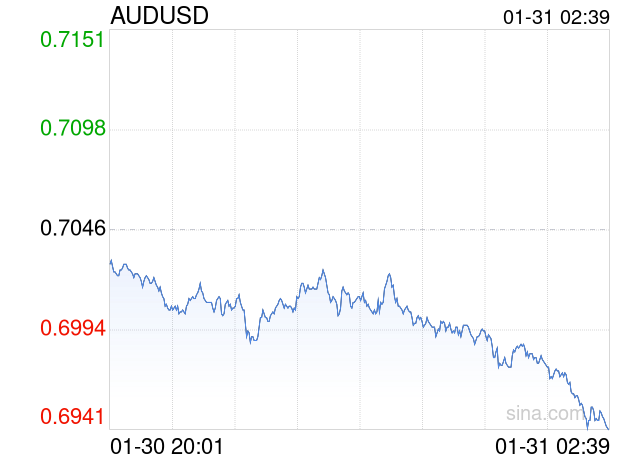 新浪外汇消息2026年01月31日,截至02时39分,外汇市场上澳元兑美元汇率跌破1澳元兑换0.6940美元。跌幅为-1.5044%