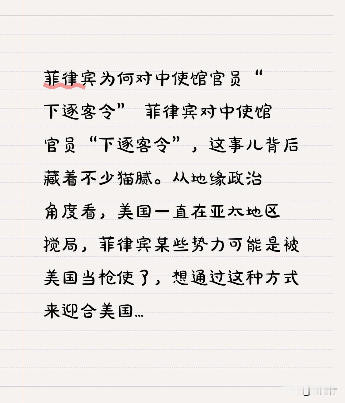 菲律宾为何对中使馆官员“下逐客令” 菲律宾为何对中使馆官员“下逐客令”?此事背后大有隐情。从地缘政治层面分析,美国长期在亚太地区兴风作浪,菲律宾部分势力或许沦为美国的“棋子”,妄图以此举迎合美国的反华战略。 此外,菲律宾国内部分政治势力出于一己私利,炮制“强硬对华”的噱头,以争取特定群体支持。然而,这种做法可谓损人不利己。中菲经贸往来密切,菲律宾众多农产品依赖中国市场。“赶走”中使馆官员,只会破坏两国关系,让菲律宾在经济和外交上双双受损,实乃不明智之举。应让菲律宾付出代价。