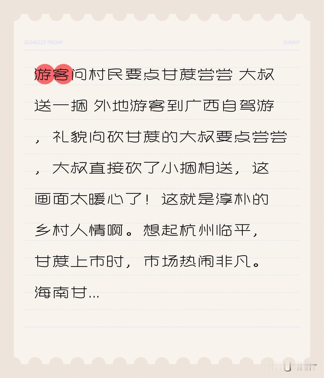 游客问村民要点甘蔗尝尝 大叔送一捆 外地游客到广西自驾游,一位游客向正在砍甘蔗的村民礼貌询问能否尝点甘蔗,大叔直接砍了一小捆相赠,这暖心的一幕令人动容,尽显淳朴的乡村人情。 这让我想起杭州临平甘蔗上市时,市场热闹的场景。海南甘蔗形似竹竿,价格偏高;浙江江山的甘蔗,紫皮 15 元一根,青皮 18 元一根。本地甘蔗外观普通,却清甜可口,一捆 10 根卖 50 元,单根 10 元,不少人为这口甜不惜驱车 20 公里购买。 与花钱买甘蔗相比,广西大叔免费送甘蔗,更让人感受到人与人之间纯粹的善意,这才是旅行中最珍贵的收获,尽显农人骨子里的憨厚实在与热情。