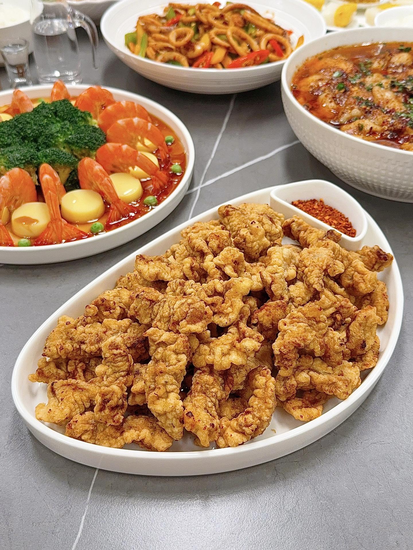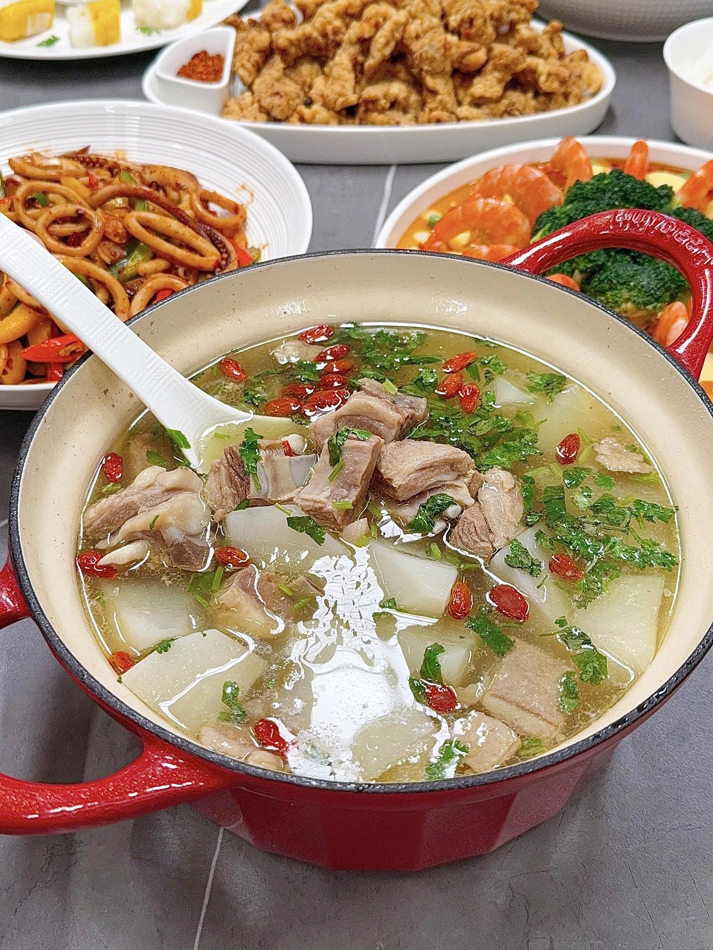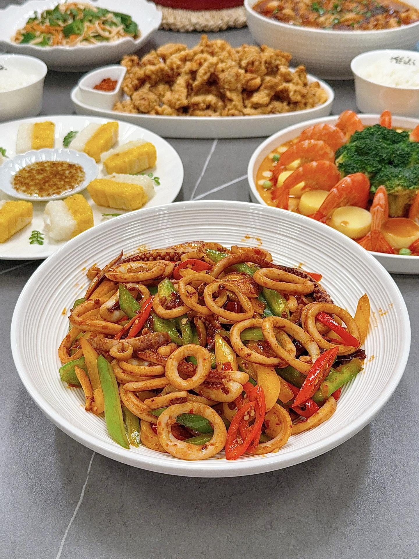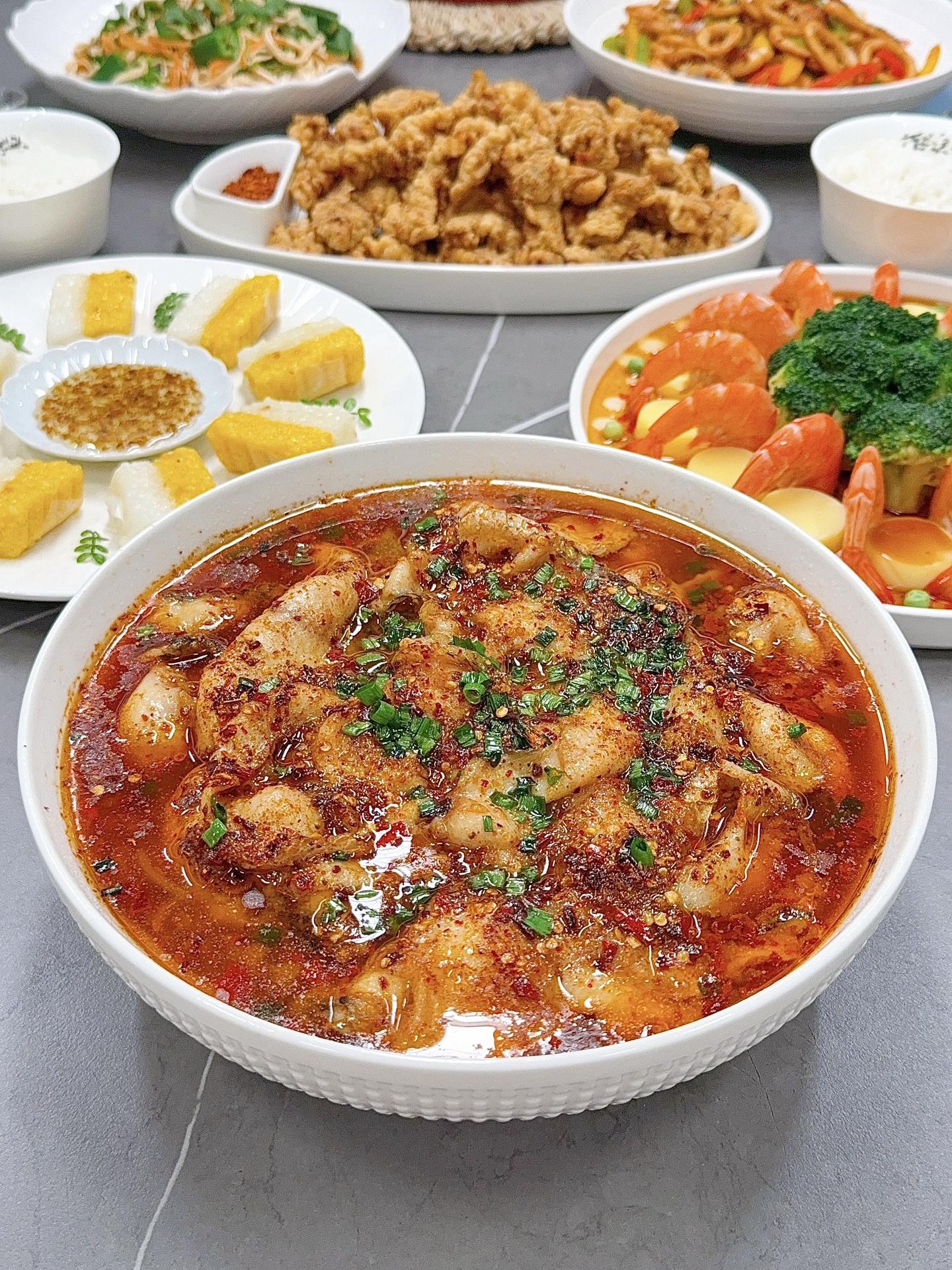 我家的年味,就藏在这桌热气腾腾里。家的温度,是从我系上围裙开始的。🧑🍳 慢慢炖上一锅汤,仔细备好几样菜。想把这一年对家人的惦念,都烹调进今晚的饭菜里。 🧧新年家宴菜单分享: ❶【花开富贵虾】 ❷【小酥肉】 ❸【水煮鱼】 ❹【香辣鱿鱼】 ❺【羊肉萝卜汤】 ❻【凉拌素什锦】 ❼【黄米凉糕】 🍓水果:草莓&车厘子