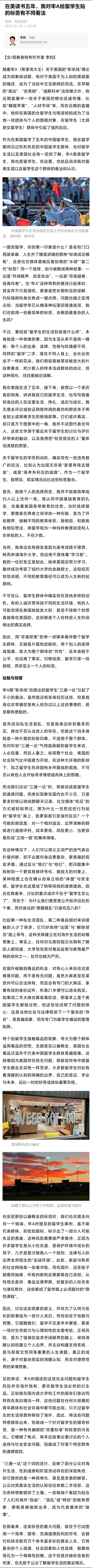 #在美留学生对牢A贴标签有不同看法# 留学生:这类标签的最大问题,就在于它将复杂的个人境遇、社会因素和人性选择,粗暴地简化为一个侮辱性的梗。这不仅是对被标签者的伤害,也无助于公众了解留学生活的真实情况。#留学生称三通一达是恶意的解答#