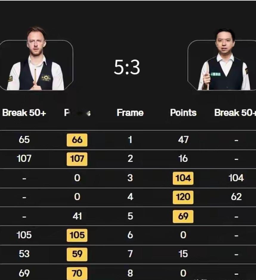 斯诺克德国大师赛肖国栋连输三局3:5不敌特鲁姆普止步八强 北京时间1月31日凌晨,2026斯诺克德国大师赛1/4决赛尘埃落定。四强全部产生,他们分别是肖恩墨菲、阿里卡特、尼尔罗伯逊和特鲁姆普。在刚刚结束的一场比赛中,中国独苗肖国栋在3-2领先的大好局面下,连输三局。3-5不敌世界排名第一的特鲁姆普止步八强。至此,中国球员的德国大师赛已经结束了。 特鲁姆普与肖国栋两人职业生涯交手13次,肖国栋仅胜2次,近年来,肖国栋迎来了对特鲁姆普的10连败,可谓是被特鲁姆普全面碾压。因此,肖国栋不敌特鲁姆普完全在球迷朋友的意料之中。比赛过程如下: 第一局,特鲁姆普率先发力打出单杆65分,66:47先拔头筹,取得开门红! 第二局,特鲁姆普愈战愈勇,轰出单杆107分破百,107:16再下一局,取得局分2:-0的领先。 第三局,肖国栋不甘示弱,立即回敬单杆104分破百,零封特鲁姆普,把局分追到1-2。 第四局,肖国栋延续良好的状态,凭借单杆62分,120:0再下一局,前四局结束,双方战成2-2平,进入局间休息。 第五局,肖国栋做出高质量的斯诺克,特鲁姆普解球连续失误被罚掉了12分,最终肖国栋69:0拿下此局,一波三连鞭反超局分3-2。 第六局,特鲁姆普轰出单杆105分破百,零封肖国栋,双方战成3-3平。 第七局,特鲁姆普凭借单杆53分,59:15获胜,连赢两局反超比分4-3领先,率先拿到赛点。 第八局,特鲁姆普没有给肖国栋机会,再次凭借单杆69分,70:0收割比赛。特鲁姆普以大比分5-3锁定胜局。最终,肖国栋连输三局,无缘晋级德国大师赛的四强。斯诺克大师赛 斯诺克盛典
