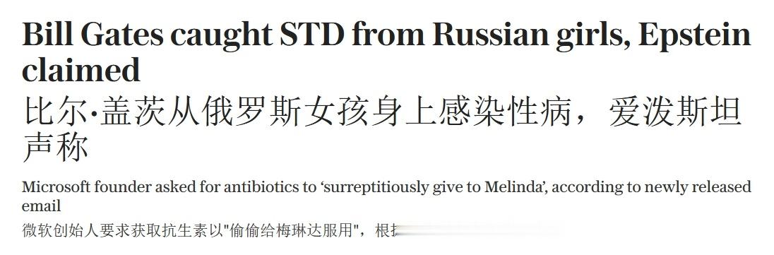 据每日电讯报30日报道,美国司法部新公布的文件称,杰弗里·爱泼斯坦曾指控比尔·盖茨与“俄罗斯女孩”发生关系后感染性传播疾病,并要求提供抗生素以秘密给妻子服用。