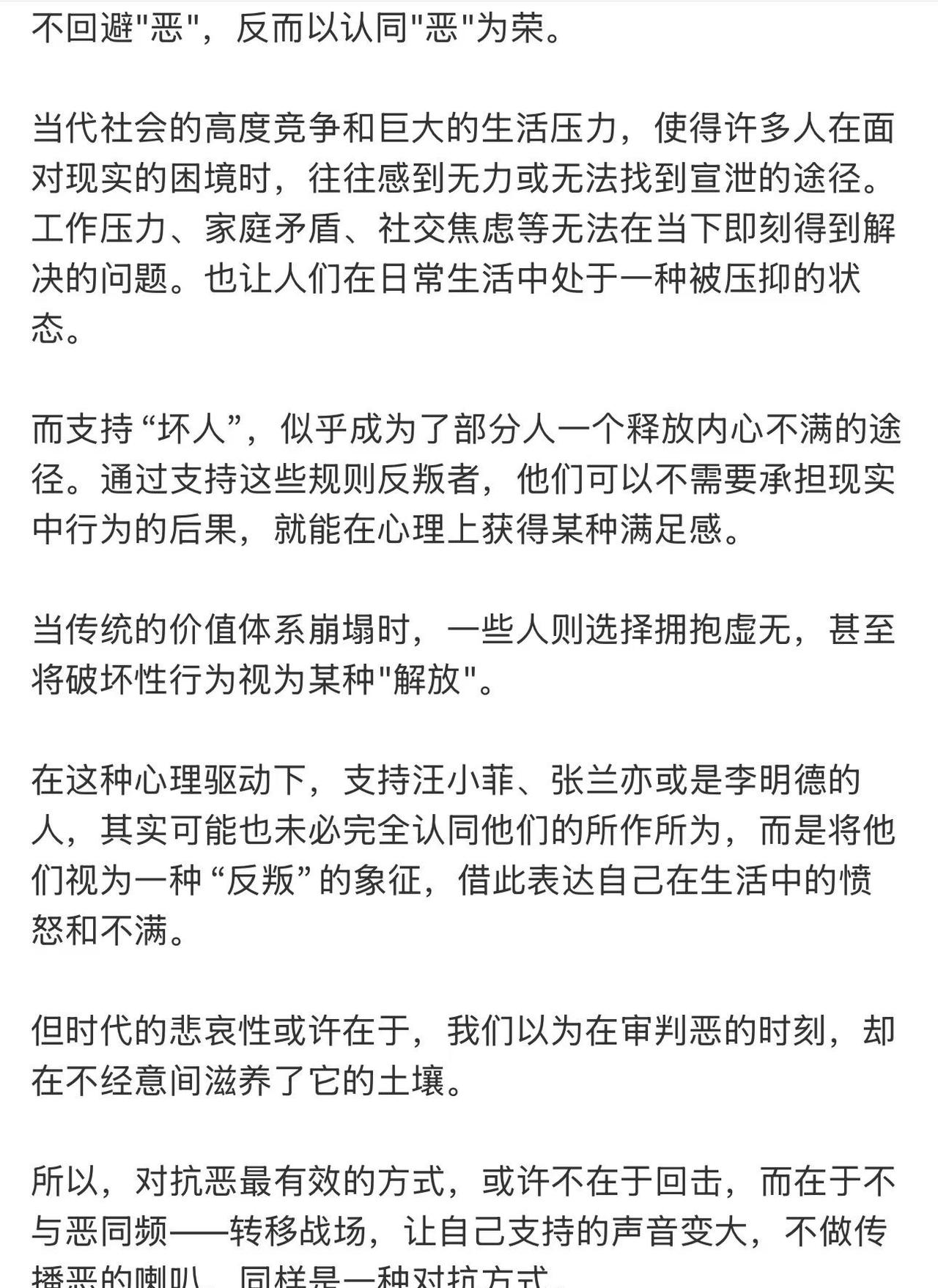 S,我一直很想念你 原作者:@梁州 所以,对抗恶最有效的方式,或许不在于回击,而在于不与恶同频——转移战场,让自己支持的声音变大,不做传播恶的喇叭,同样是一种对抗方式。 阅读 女性成长 分享 愿你的纯真与经历无关 勇敢的拥抱生活吧 girlstalk 生命的力量在于不服从 让自己充满力量和勇气 满怀希望就无所畏惧