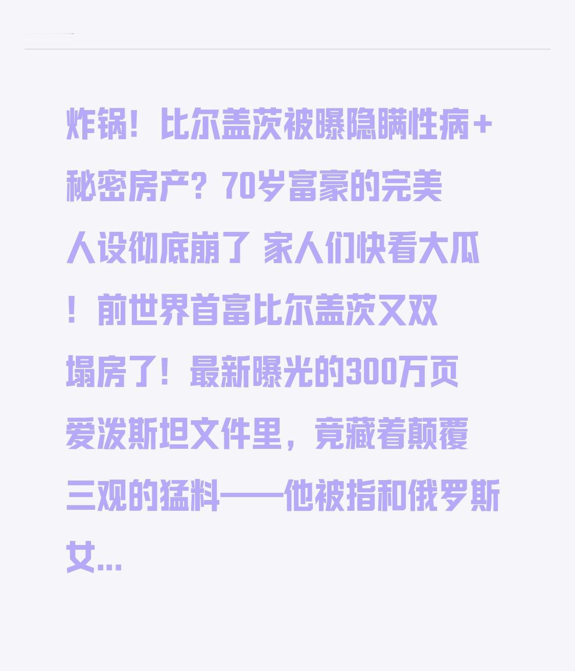 炸锅!比尔盖茨被曝隐瞒性病+秘密房产?70岁富豪的完美人设彻底崩了 家人们快看大瓜!前世界首富比尔盖茨又双叒叕塌房了!最新曝光的300万页爱泼斯坦文件里,竟藏着颠覆三观的猛料——他被指和俄罗斯女孩发生关系后染病,还偷偷要抗生素想给妻子梅琳达服用,更离谱的是,离婚5年才发现,他竟瞒着妻子藏了数亿房产! 谁还记得当年盖茨夫妇离婚时,那句“价值观分歧”的体面说辞?现在看来全是烟雾弹!早在2011年,盖茨就和性犯罪者爱泼斯坦频繁往来,不仅多次登岛聚会,还被助手爆料“需要药品应对与俄罗斯女孩的亲密后果”。更讽刺的是,这位以慈善家自居的富豪,一边在公开场合呼吁公共卫生,一边却被指隐瞒性病,甚至想让妻子“被服药”,盖茨团队急着否认“完全捏造”,但文件里的邮件记录和证人证词,让网友直呼“细思极恐”。 但反转来了!比起健康丑闻,他隐瞒的房产才更让人咋舌!离婚案曝光,盖茨在全球坐拥天价房产:6300万美元的“世外桃源”庄园,有18米泳池和私人图书馆;2700万美元的佛罗里达度假牧场,还有4300万的加州海滨豪宅,甚至被传建了核灾难级末日地堡,配备迷你核反应堆和垂直农场。这些资产大多是婚姻存续期间购置,却直到离婚分割760亿财产时,梅琳达才知情,网友吐槽:“这哪是隐瞒,简直是藏了个财富帝国!” 更狗血的是离婚细节,梅琳达在书里透露,早在2000年就发现盖茨和微软女员工的婚外情,隐忍多年后,爱泼斯坦事件成了压垮骆驼的最后一根稻草。两人竟在汉堡店边吃边谈离婚,她形容盖茨是“最难缠的谈判者”,甚至因压力恐慌发作。而盖茨一边给前妻捐550亿“封口费”,一边火速和甲骨文前CEO遗孀恋爱,完美人设彻底碎一地。 其实这场闹剧戳破了一个真相:再有钱的豪门婚姻,也逃不过信任二字。盖茨用27年婚姻打造“模范夫妻”形象,却在私生活里满是欺骗,那些藏起来的房产、隐瞒的秘密,终究抵不过纸包不住火。我们普通人或许没有千亿财富,但婚姻里的坦诚与尊重,才是最珍贵的资产。 你觉得盖茨的否认可信吗?豪门婚姻到底有没有真爱?评论区聊聊你的看法,关注我,后续更多内幕持续跟进!