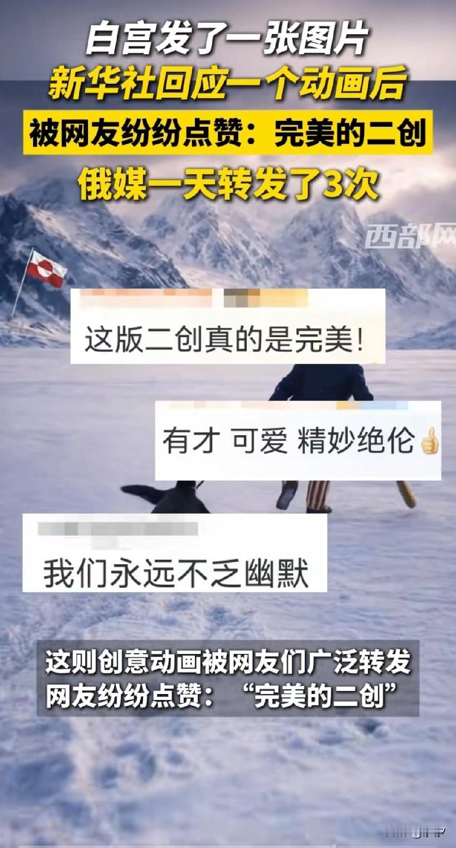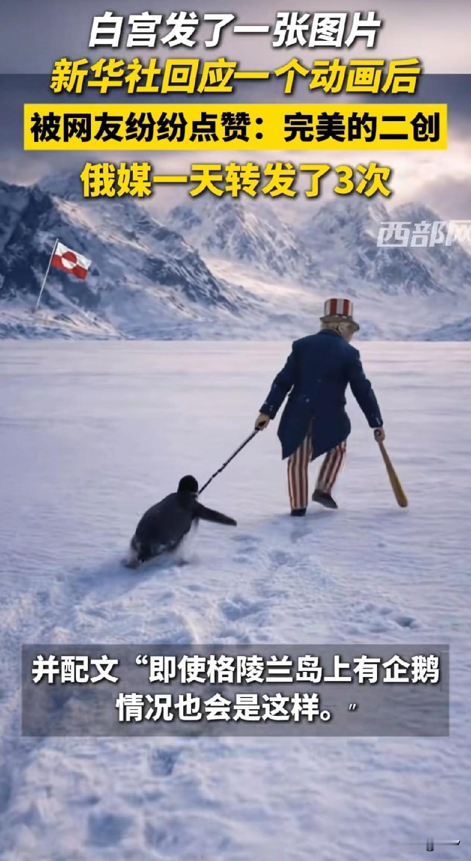 白宫发了一张照片之后, 新华社有才的同事来了个二创, 就是把特朗普换成了一个小丑, 白宫发的是特朗普拉着一只企鹅举着美国国旗,从容的走向了格陵兰岛! 新华社的二创是? 一个小丑戴着帽子,拿着大棒拉着一只企鹅把它往格林兰岛了, 可以说这个二创实在是太逼真了, 而且还有很大的讽刺意味, 不得不说这个二创太有才, 很符合现在年轻人对互联网的思考, 很多网友也是忍不住进行夸, 说这是最好的二创! 搞笑的是俄媒还转发了三天, 可以看出大家都是这样想! 明明是去抢夺格陵兰岛, 非要长得跟大帝登基一样, 结果被这样讽刺实在太好玩了! 特朗普再谈格陵兰岛:不排除军事夺取 特朗普自娱自乐
