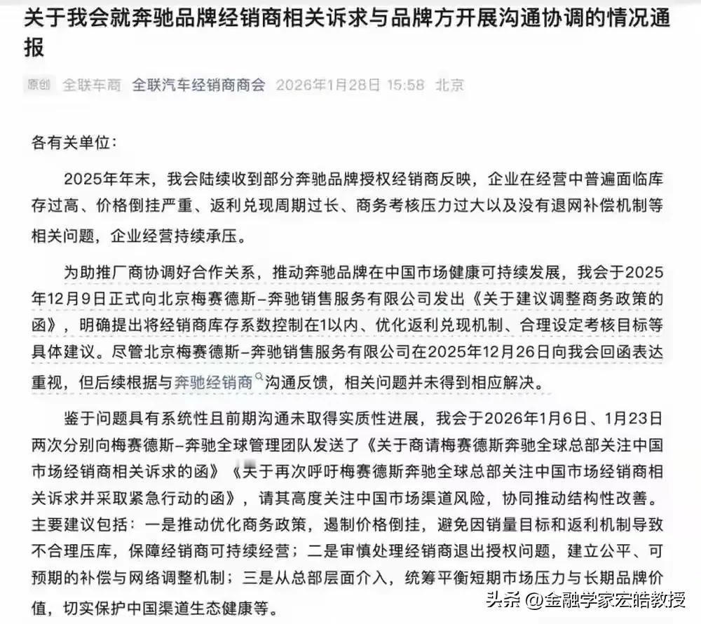 怪不得德国总理急着访华?原来不愁卖的奔驰早已风光不再! 根据《新黄河》消息,奔驰新车大量积压,经销商卖一辆亏一辆,全靠厂家返点勉强维生,2025年在华销量暴跌19%退回十年前。 奔驰滞销的核心问题就三点: 第一,电动化转型迟缓,纯电车型占比仅8.1%; 第二,智能化体验落后,车机智驾远逊国产新势力; 第三,渠道矛盾突出,库存高企还被压销量指标。 说实话,现在大街上确实很难看见奔驰车,满眼都是国产新能源车,奔驰想破局,就得加速纯电平台国产、升级智驾车机适配中国市场,不行就低下骄傲的头,谦虚地找华为合作啊!另外,更要松绑经销商考核,实打实共担市场压力。唯有深度本土化,才能找回中国消费者的认可!