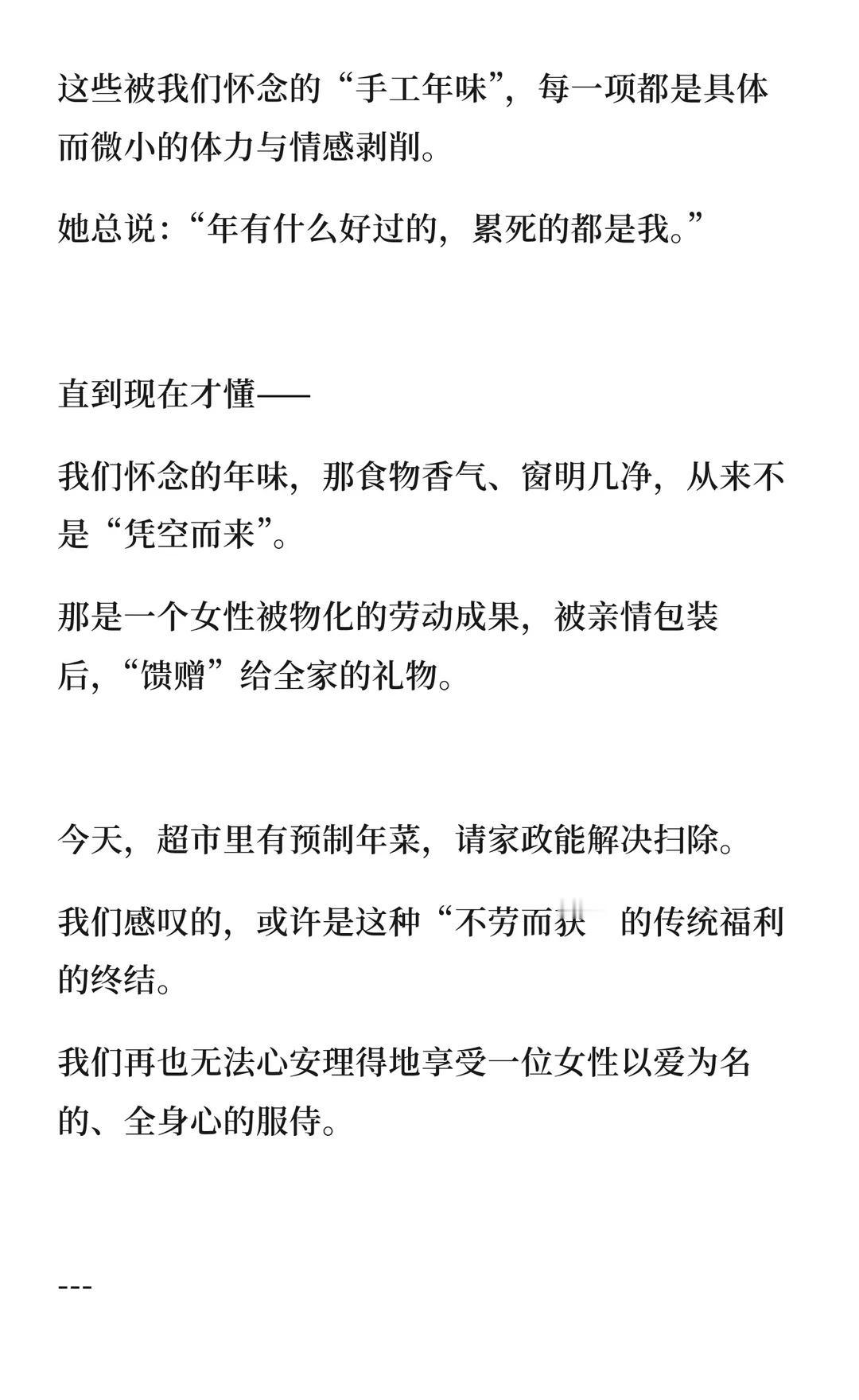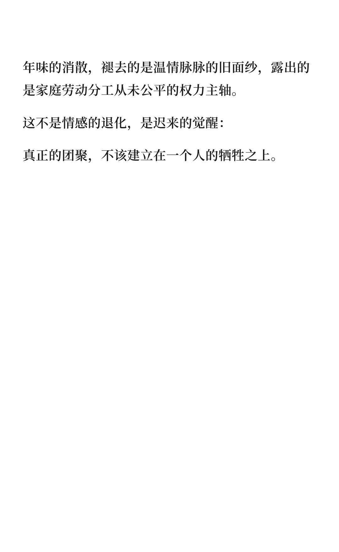 年味的消失,是女性不再沉默的罢工! (年味的消失揭示了家庭权力结构的不平等,母亲们承担了大量无偿劳动,编织出团圆幻象。新一代女性看清了这一不平等,不再甘愿牺牲,年味回归为共同承担的假期,真正的团聚不应建立在牺牲之上。) 欢迎来到中女时代 女性的困境和力量 女性主体性 正视女性困境 女性不被束缚 临江仙仙仙仙仙 年味 家庭劳动