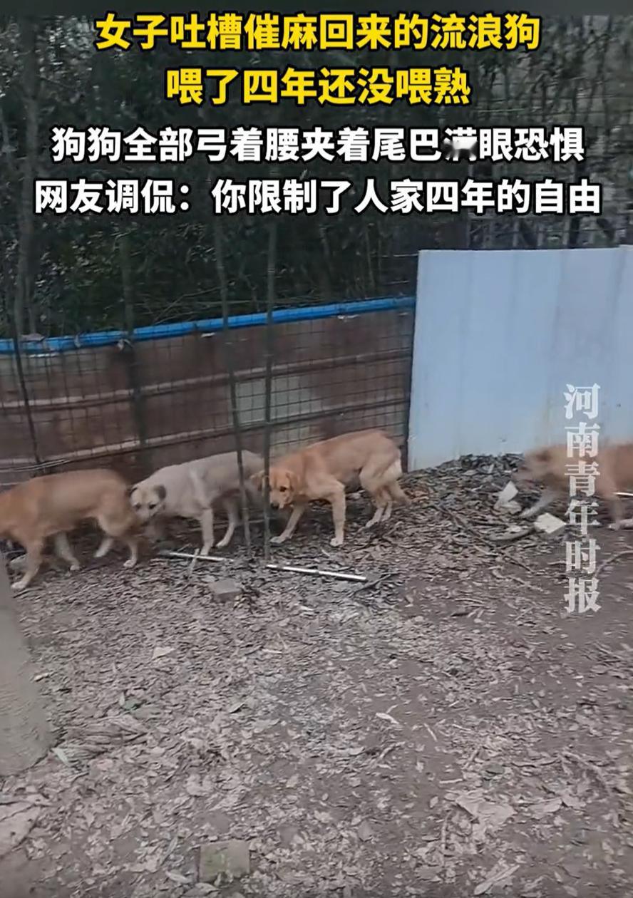 江苏,一女子在网上吐槽,自己吹麻带回了几只流浪狗,可自己养了4年,到现在都没有养熟,看到狗子见到她就弓腰夹尾巴,女子也是越看越气愤。网友:你不是也限制人家四年的自由 很多人都说流浪狗通人性,你对它好,它就会把你当主人,这名女子四年前收留了几只流浪狗,一直养在自家院子里。每天喂饭、照料,按理说也该处出感情了。可事实却完全相反 每次女子走近院子,几只狗没有摇着尾巴迎上来,反而全都弓着背、夹着尾巴,眼神警惕,甚至透着一丝恐惧。那样子不像是见了主人,倒像是见了什么让它们害怕的人 女子自己也憋屈,一边拍视频一边抱怨:我喂你们都喂了四年了,还喂不熟!怎么喂你们都喂不熟! 不少网友看完反倒替狗子说话,说这不是熟不熟的问题,更像是一直没真正放松过。把流浪狗带回家,本身是好心,这点没人否认。可好心不等于结果一定是好的。对狗来说,从街头到院子,环境是换了,自由也没了。院子再大,本质还是一个固定空间,和它们原来熟悉的世界完全不同 很多人容易把养狗这件事理解得很简单,有吃有住就够了。可流浪狗身上最难修复的,往往不是挨饿,而是不信任 狗的反应是最真实的。弓背、夹尾、躲闪,这都是动物在感到不安、恐惧时的本能表现。它们不会伪装,也不会刻意“忘恩负义”。如果四年都没放松下来,那很可能这段关系从一开始就没有建立信任 如果真的爱,或许该问问自己:你给的是它需要的,还是仅仅是你想给的?爱不是占有,而是让彼此都感到舒适。这道理,对人如此,对狗也一样
