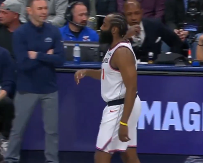 美媒BrickCenter晒出比赛中的一段视频,在末节詹姆斯-哈登上场后,掘金解说员评论: