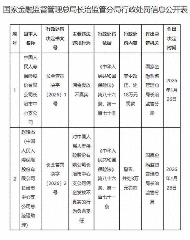 1月30日,据国家金融监督管理总局长治监管分局发布行政处罚信息公开表显示,中国人民人寿保险股份有限公司长治市中心支公司因佣金发放不真实,被责令改正,处18万元罚款。