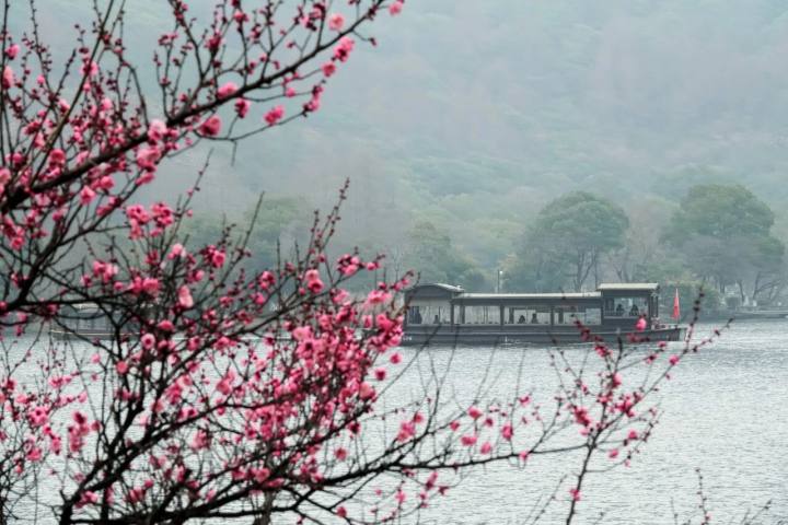 乘船游一二期沿着碧波荡漾的湖面缓缓前行,能看到越风楼前一大片梅林的花影随波流转,非常漂亮。