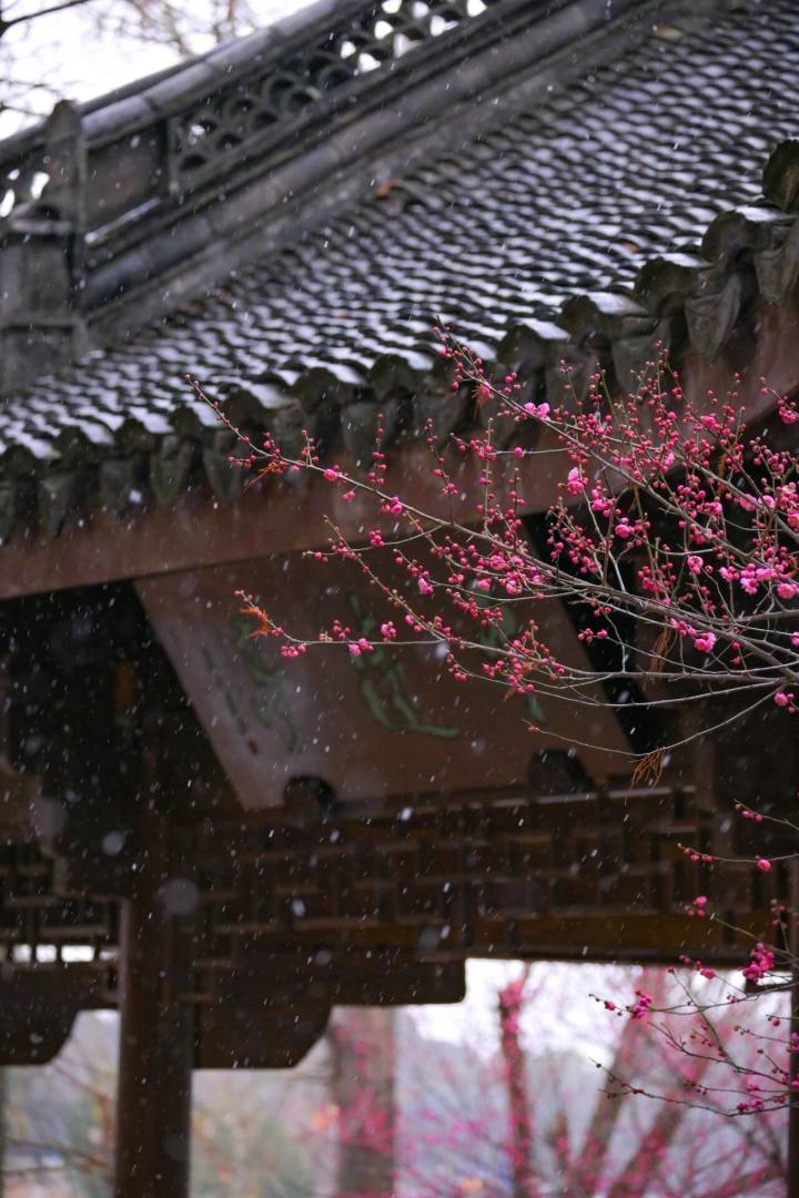 雨天赏梅更有妙趣,水汽氤氲中,花瓣晶莹剔透,红梅沾露、古亭枕湖,宛如一幅流动的江南水墨画。