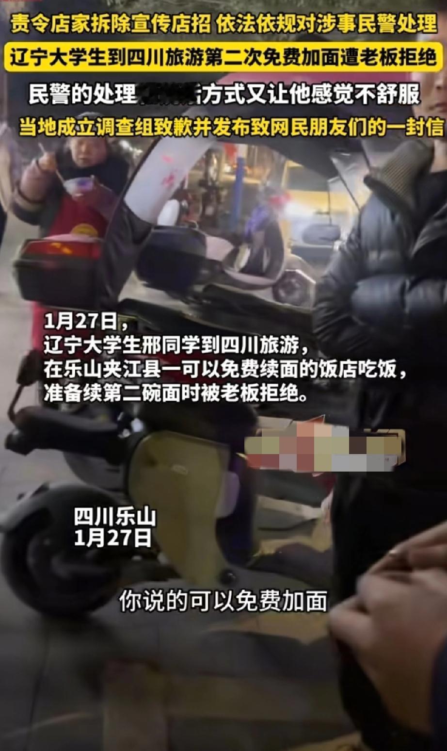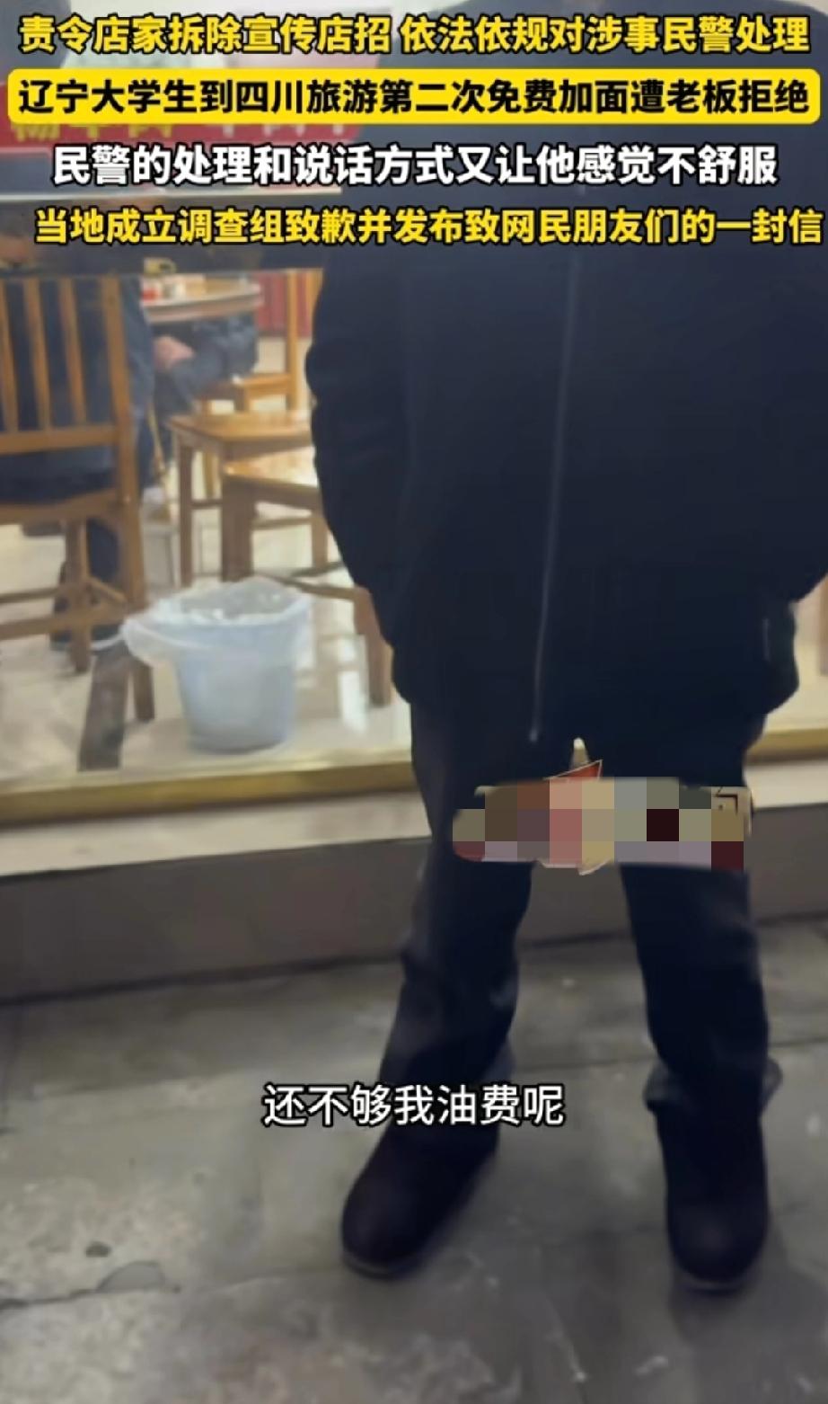 “3块钱不够油钱?”事件的后续来了! 一个外地大学生,冲着“免费续面”的招牌去吃面,结果续面多花3块钱,报警后民警来了句“3块钱还不够我油费呢”。 这话要是普通人说,也没错,可要从出警的民警嘴里说出来,那就有点变味了!本该主持公道的人,却给人一种,事儿小不值得管的感觉! 官方也给了处理结果: 店家责令拆除“免费续面”的招牌,因为虚假宣传涉嫌违法。 那位说出“3块钱不够油费”的涉事民警,已经移交督察部门处理,当地警方也给当事人打了电话道歉。 大学生拿到了500块补偿,但他直接捐了出去,没要这钱。 一碗面的风波,扯出这么多事儿,也砸了乐山文旅的招牌! 餐馆续面风波