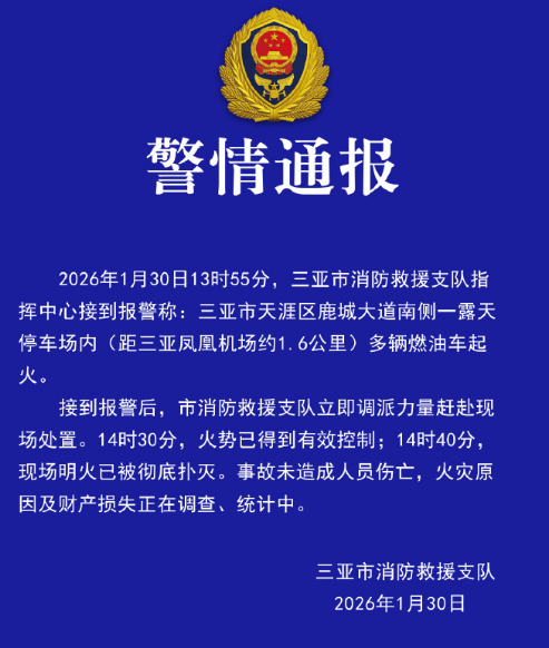 记者注意到,随后三亚市消防救援支队也对此发布了通报,称1月30日13时55分,三亚市支队指挥中心接到报警称:三亚市天涯区鹿城大道南侧一露天停车场内(距三亚凤凰机场约1.6公里)多辆燃油车起火,接到报警后,支队立即调派力量赶赴现场处置。14时30分,火势已得到有效控制;14时40分,现场明火已被彻底扑灭。事故未造成人员伤亡,火灾原因及财产损失正在调查、统计中。