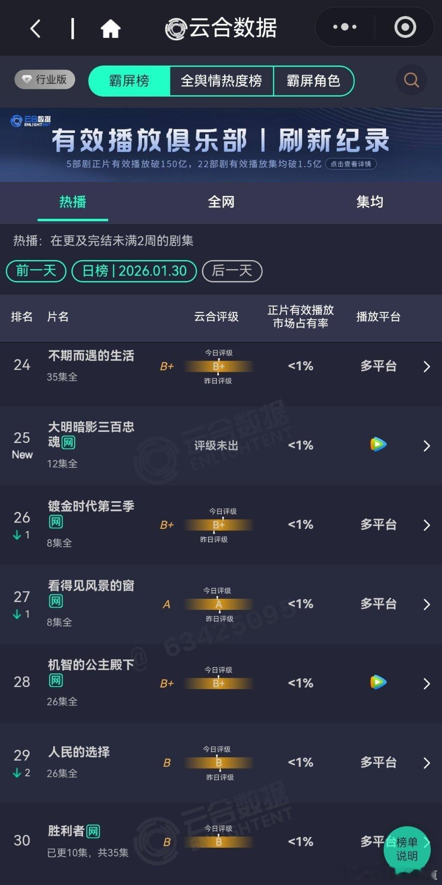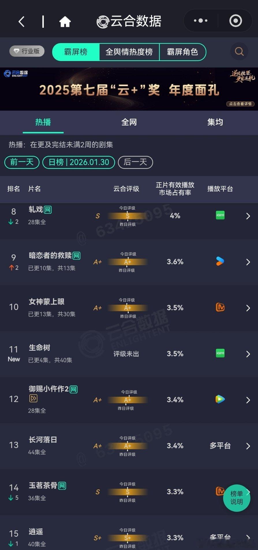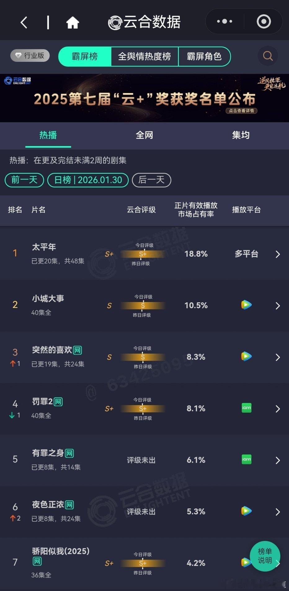 1月30日云合播放占比云合 太平年18.8%评级微涨,大盘应该涨了不少小城大事10.5%S+还是没戏。突然的喜欢8.3%有罪之身6.1%横盘了,不过空降没什么宣发横盘也正常生命树3.5%正常热开水平,看看明天的翻倍情况。