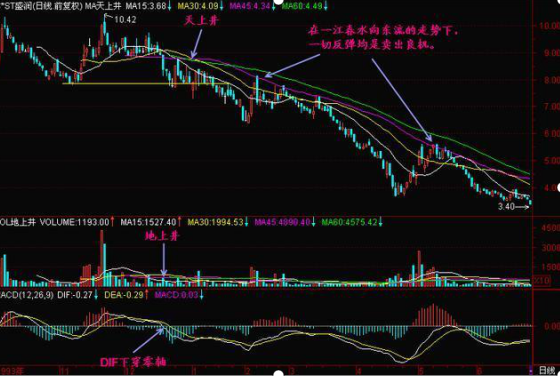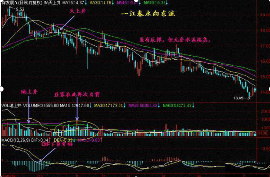 一江春水向东流:当第一根长阴线向下突破颈线位,以后可能出现几根长阴线,这在国内股市的下跌初期是常见的。而后股价几经震荡经过一个下跌通道,从日K线图上观察K线和5日、10日、20日均线犹如一江春水向东流。