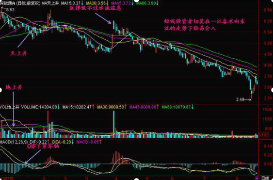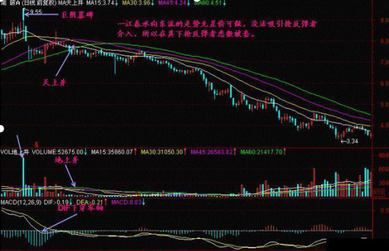 一江春水向东流的走势说明均线、K线之间呈均速下跌,等距下跌,这样的下跌行情不容易获得抢反弹资金的青睐,所以导致股价一路下滑,直到加速下跌时才可能有人来抢反弹,而中线介入的机会要等待股价不创新低了,有资金进入导致创新高了,才可能有机会。